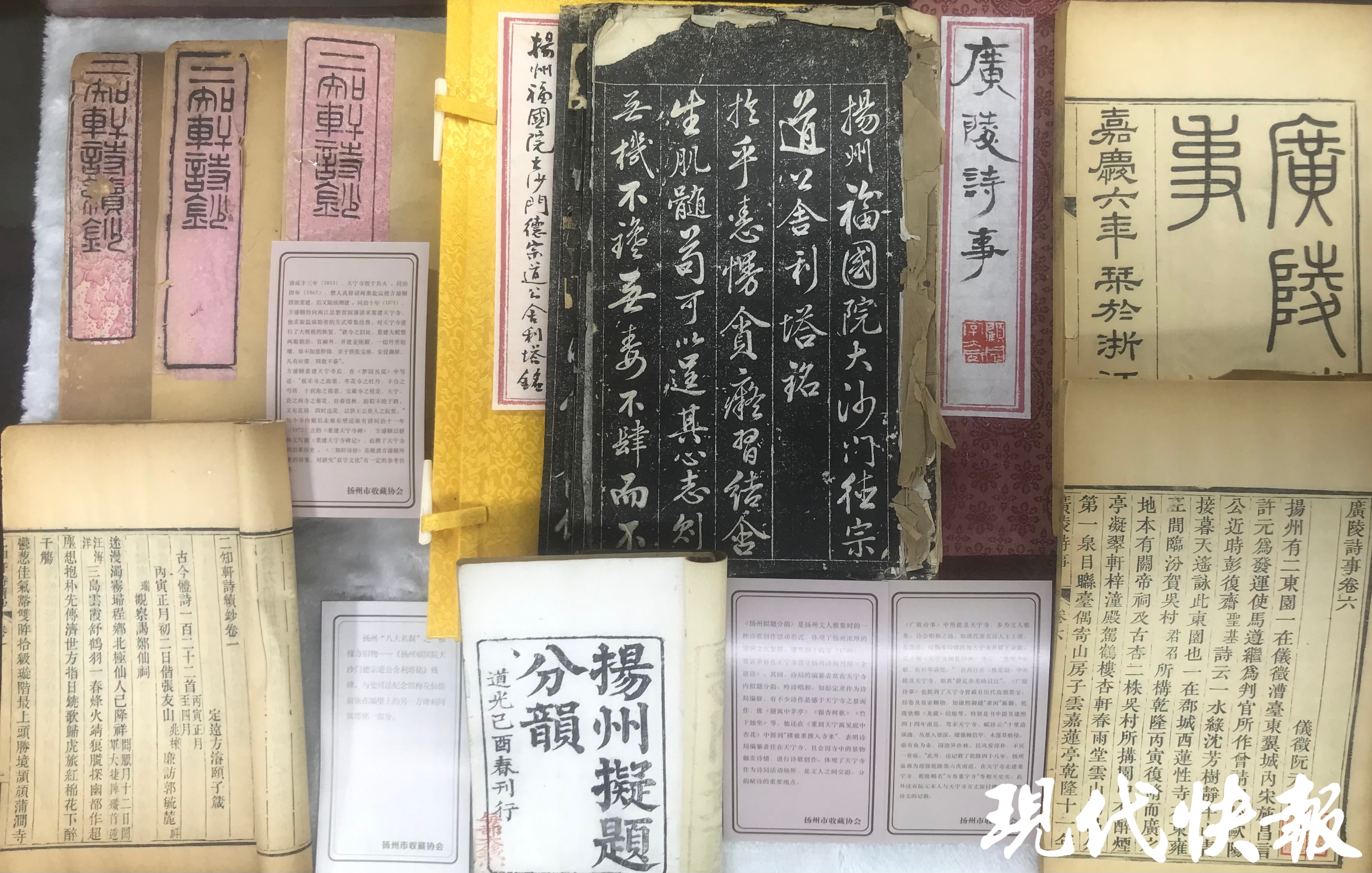 而位于藏经楼的“民藏展”展出了众多古籍珍本与碑拓文献,记录了重宁寺、天宁寺、文汇阁及扬州本土文化的深层密码。记者了解到,这些古籍文献都是由扬州市吾城记城市记忆展示馆提供。“我们收藏的众多古籍中都提到了重宁寺。”据扬州市吾城记城市记忆展示馆相关负责人介绍,关于重宁寺历史记载的典籍有1888年石印本《广陵名胜图》、1875年的《扬州画舫录》、光绪版《增修甘泉县志》及1947年纪念版的《扬州丛刻》中《扬州名胜录》等。