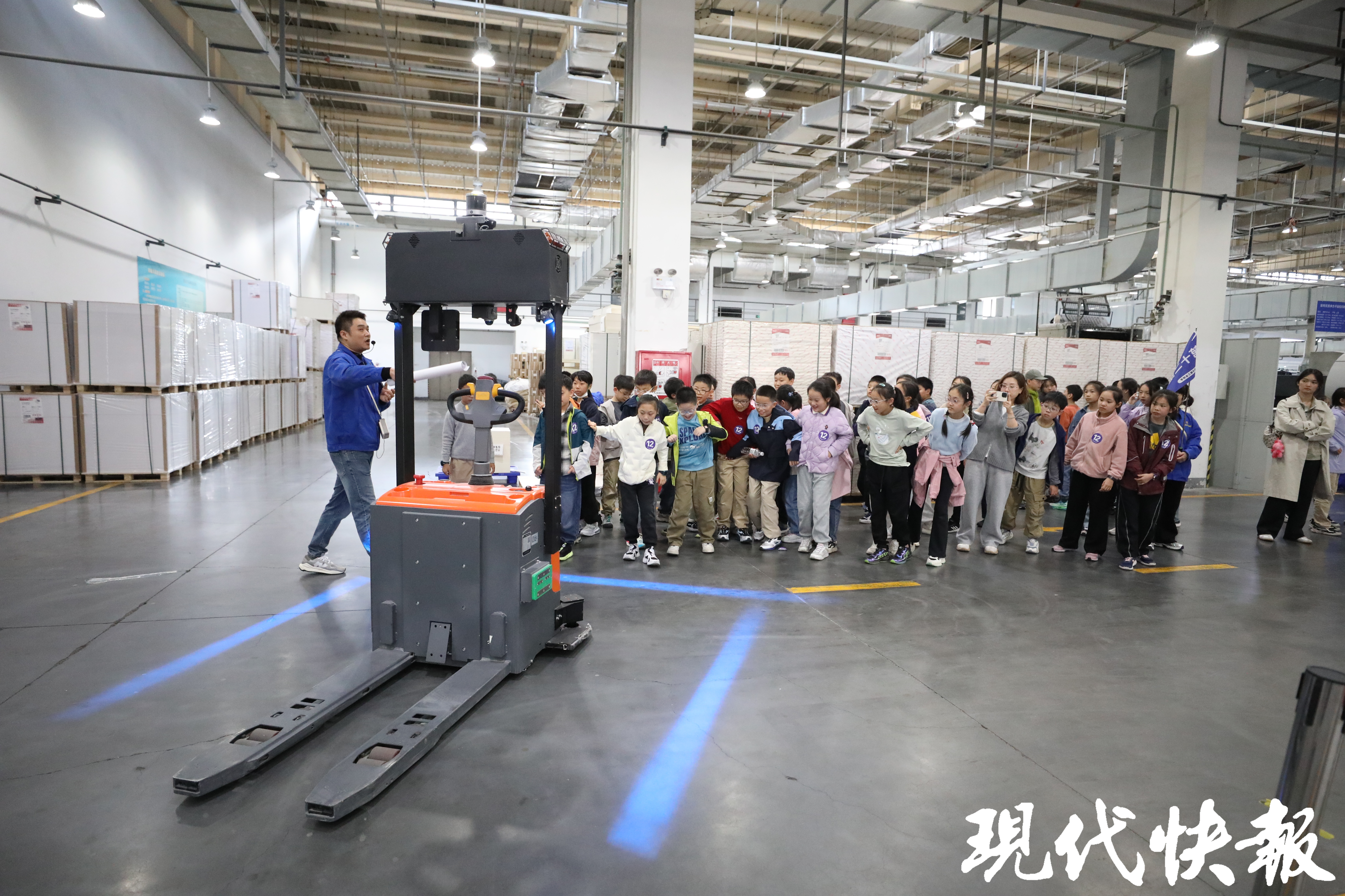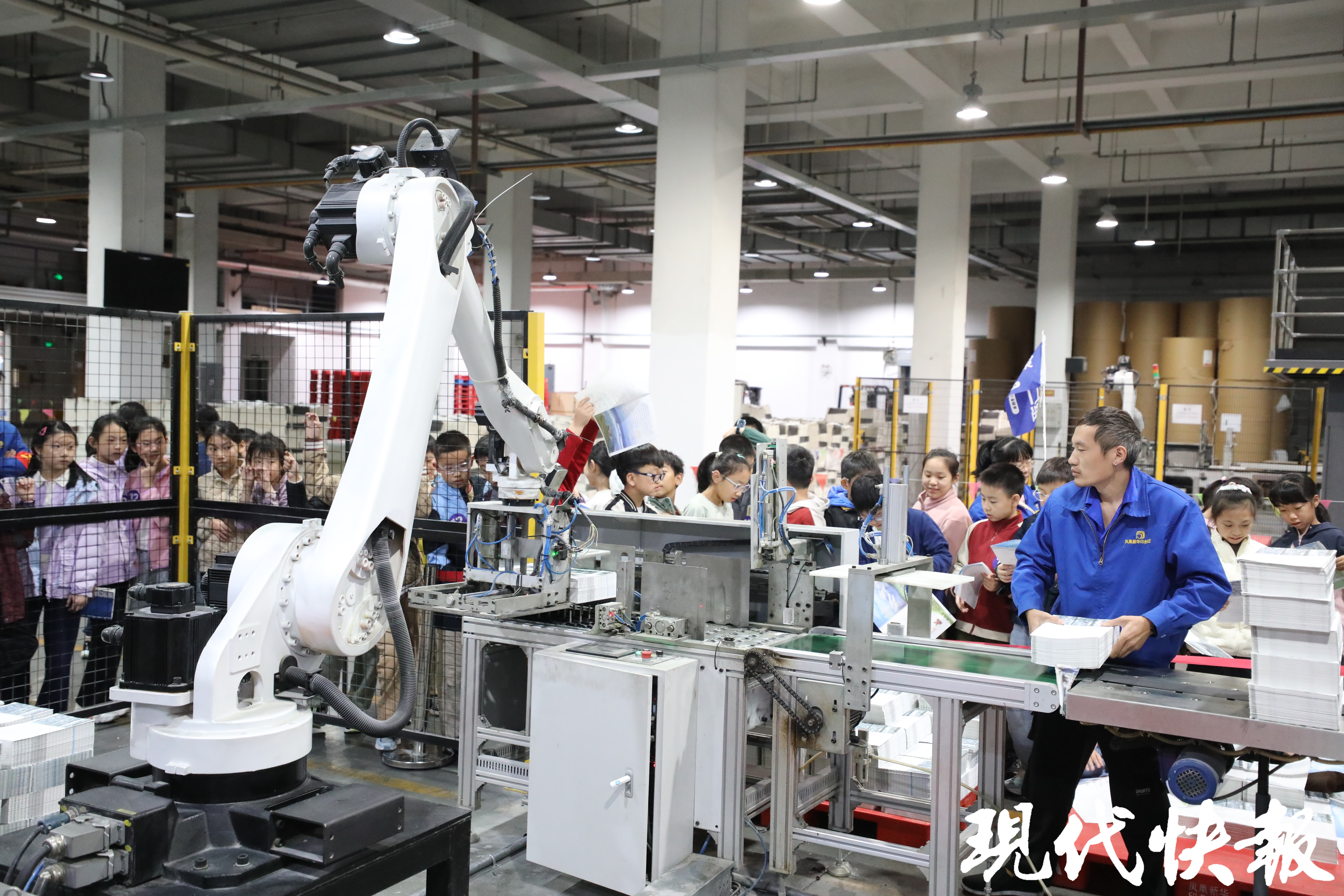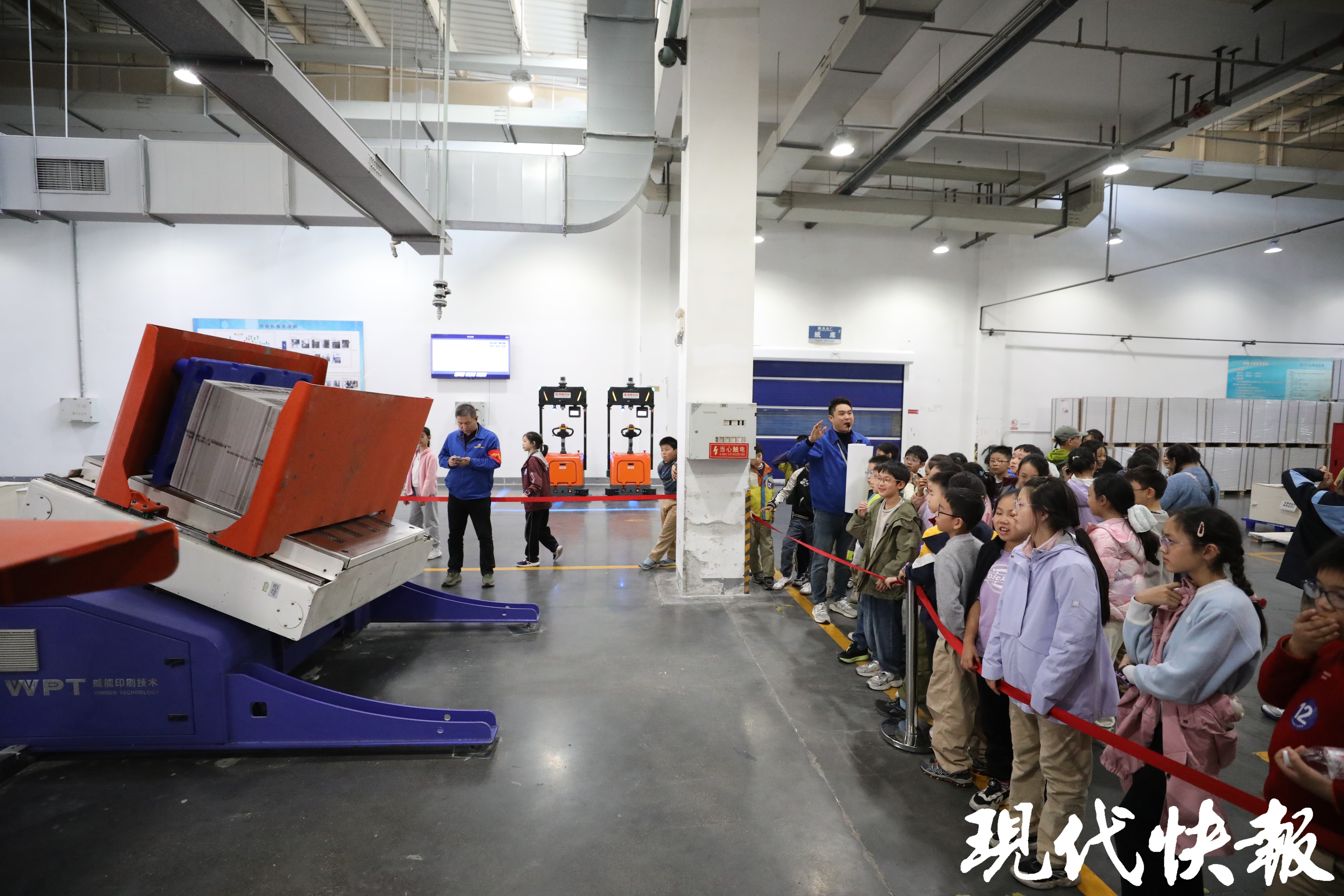 “这里是印刷你们平常学习的课本,以及各类杂志的地方。”来到智能车间,眼前大大的轮转胶印机、AGV智能小车、机械臂码垛系统让同学们目不暇接。“书本堆满了会自动运输、没电了会自己去充电、前面有人时会自动停下来……”五(6)班张若珩同学、五(8)班胡柯都对AGV智能小车印象深刻,围着小车端详。五(1)班王苏蒙同学爱好编程,他觉得这些智能化的机器能够帮助工人减轻工作压力,高效工作,“我将来还要学习更多关于智能机器的知识,未来能够帮助更多人实现高效、智能的工作。”五(7)班季艾薇和王昭文同学也兴奋地告诉记者,“我们在车间里看到的大纸筒,非常大,估计要我们班好多人一起才能抱住呢!”