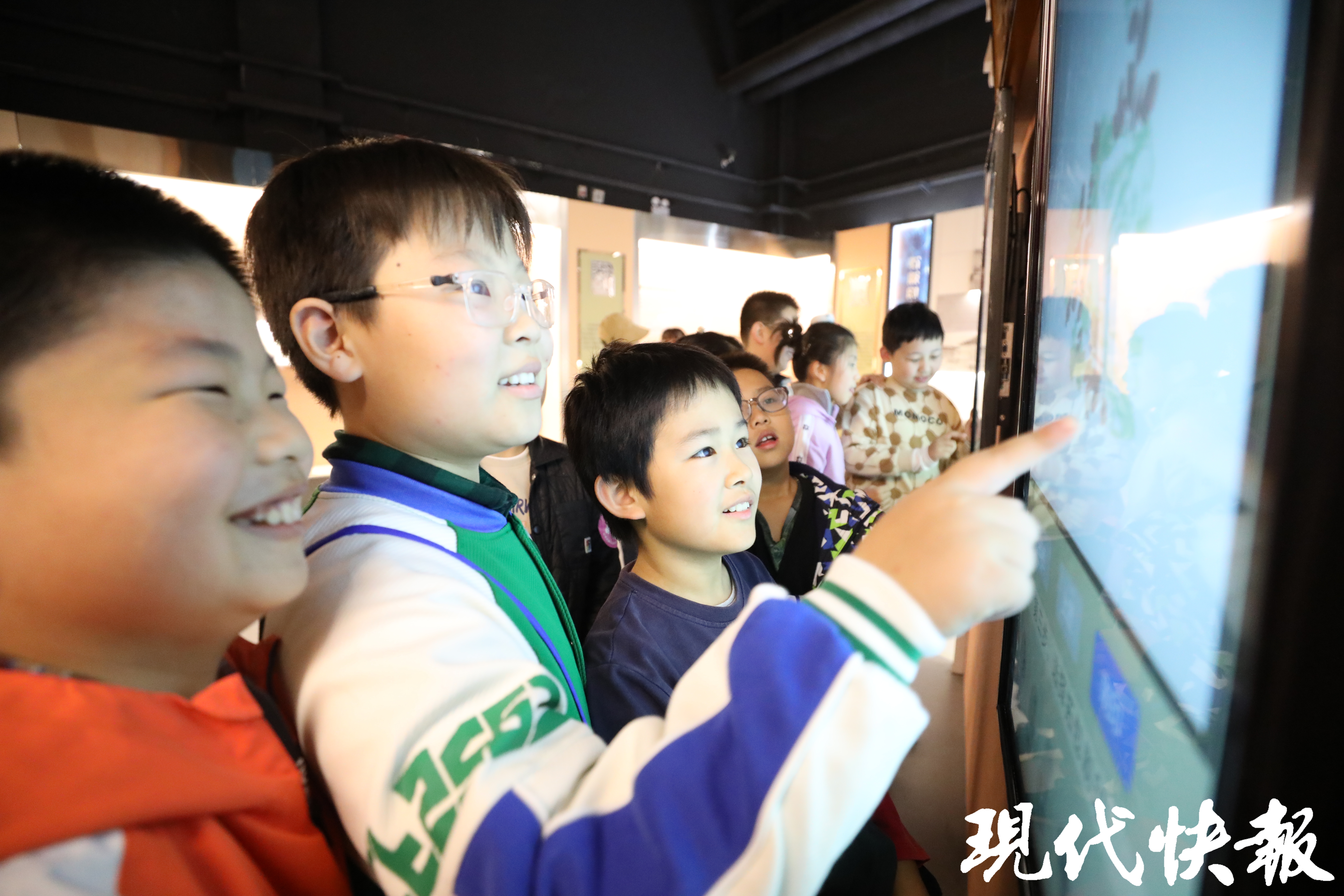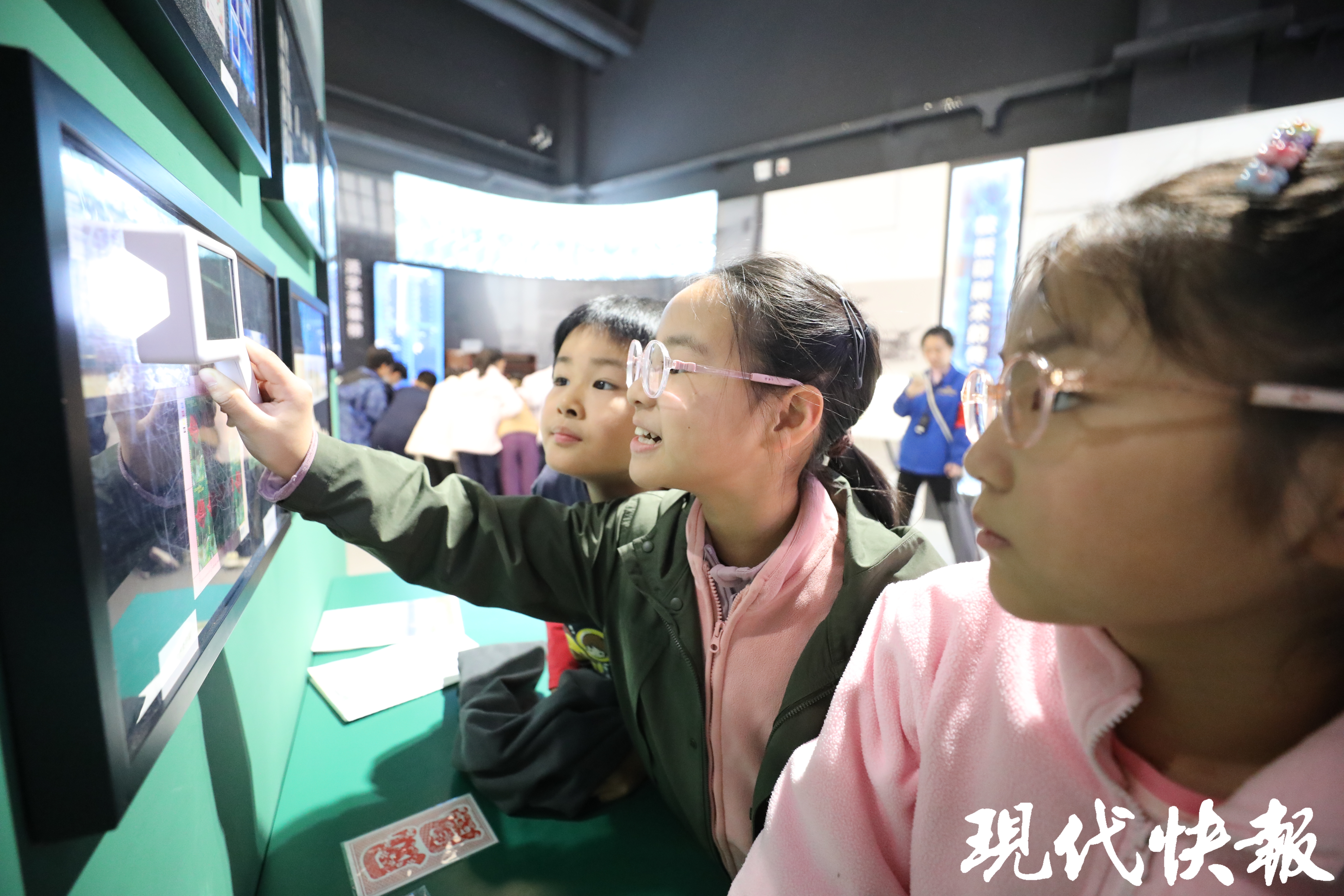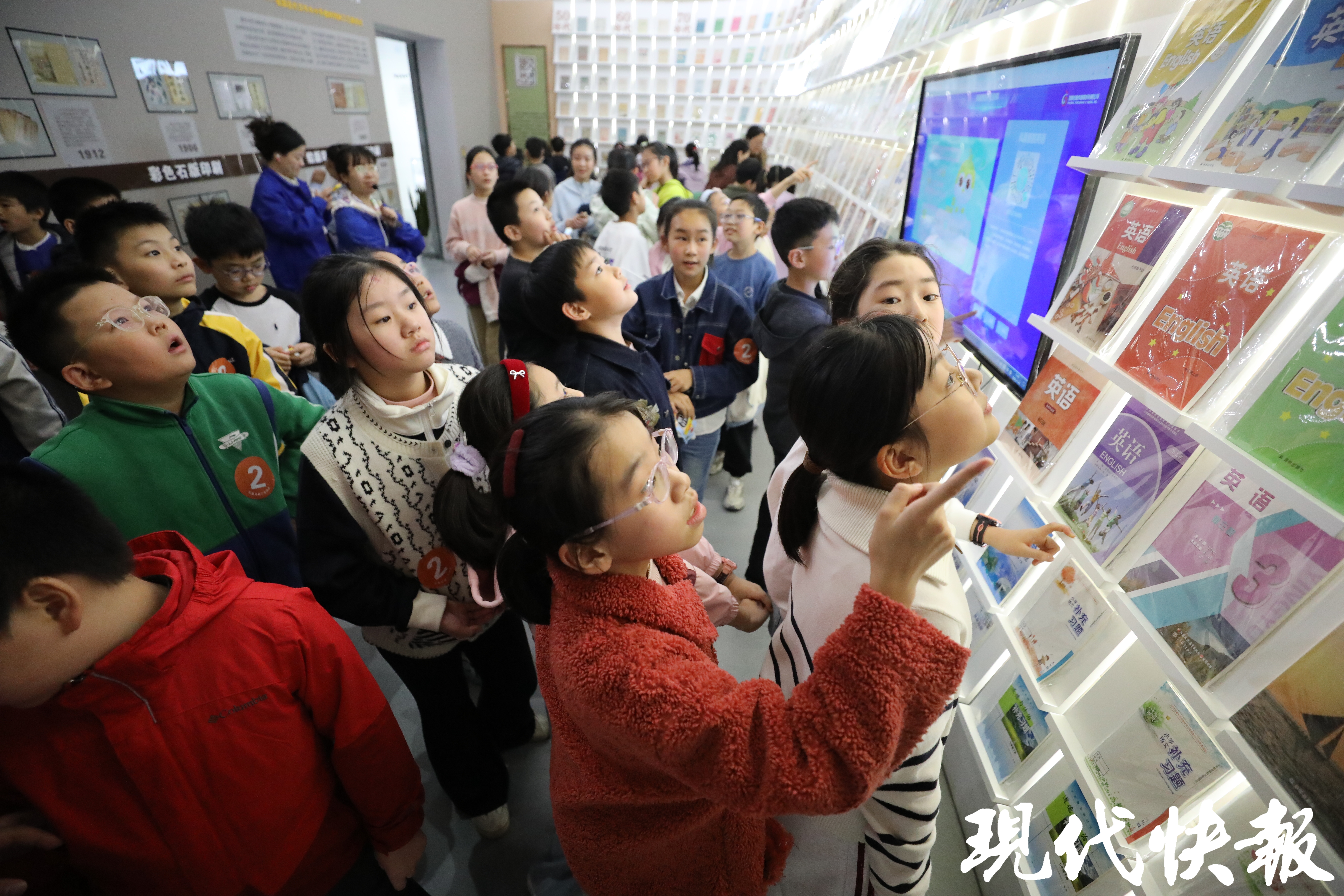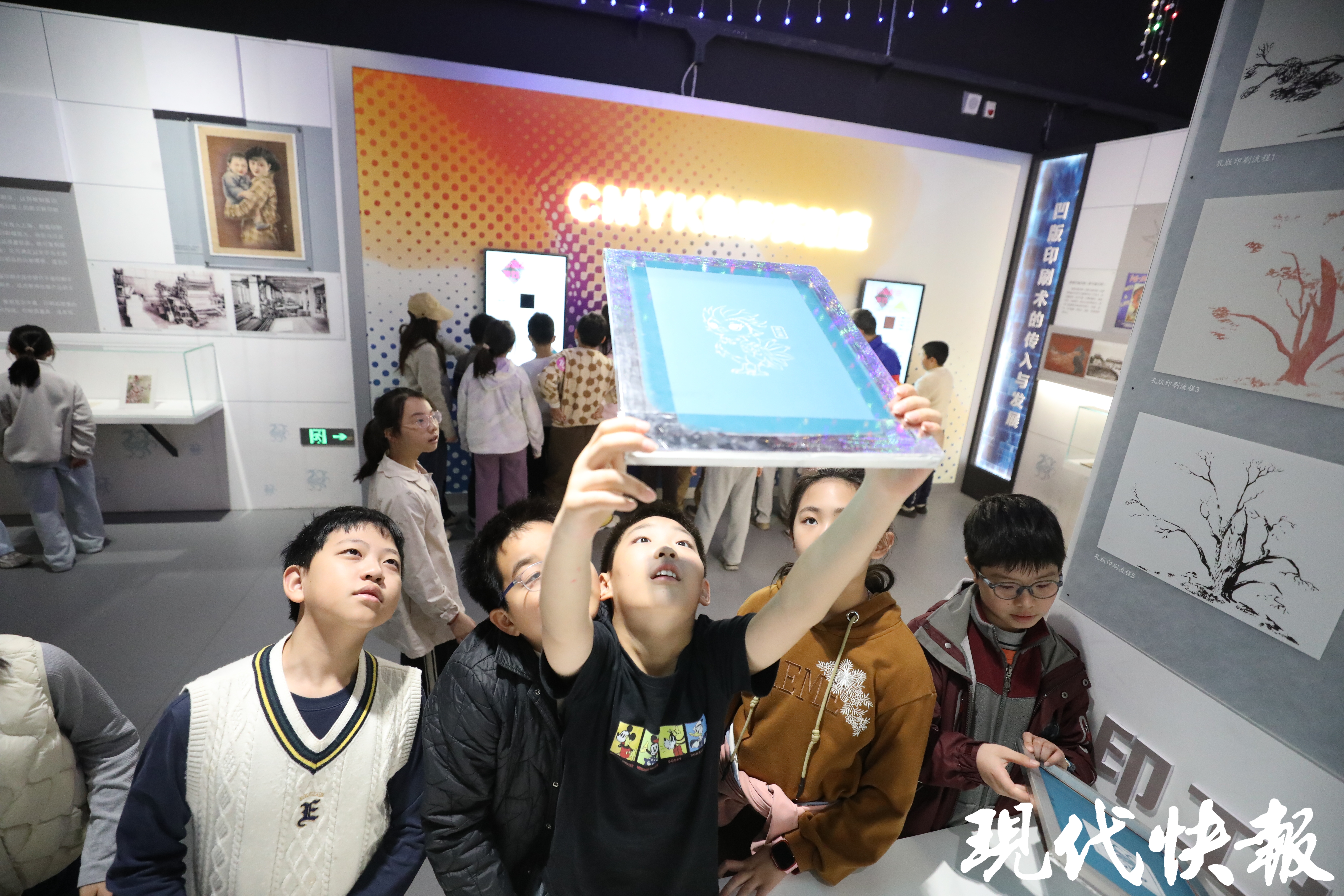 在凤凰印刷文化博物馆,学生们沿着历史长河溯源而行。从甲骨文、竹简到活字印刷,珍贵展品与数字技术交融,让文明“活”了起来。AI数字人毕昇演示的活字印刷流程,让五(1)班陶思然同学印象深刻,“我学到了活字印刷术的流程,还了解到了笔墨纸砚的历史,古人可太有智慧了!”在“姓氏寻踪”板块,五(5)班陈书禾同学找到了自己的姓氏,“我知道了‘陈’这个姓氏的由来,还有很多关于字形的知识。在博物馆里,我看到了会移动的《清明上河图》,很神奇。我还玩了‘饾版游戏’,根据屏幕上的提示,我做了一个很漂亮的树叶,太好玩了!”五(9)班王旖靖同学在博物馆的“邮梦小站”,解锁了很多关于邮票的知识,“原来用放大镜看邮票,能看到我们平常看不到的很多细小的东西,有很小的字,还有人物的形象,邮票的印刷方法也有很多种,会用到不同的印刷工艺。”参观中,一面布满了各个年代教材的展示墙更是让同学们发出阵阵惊呼,“啊!这是我们五年级的语文书、数学书”“这是我们的补充习题啊”……看到自己熟悉的课本,孩子们激动不已。