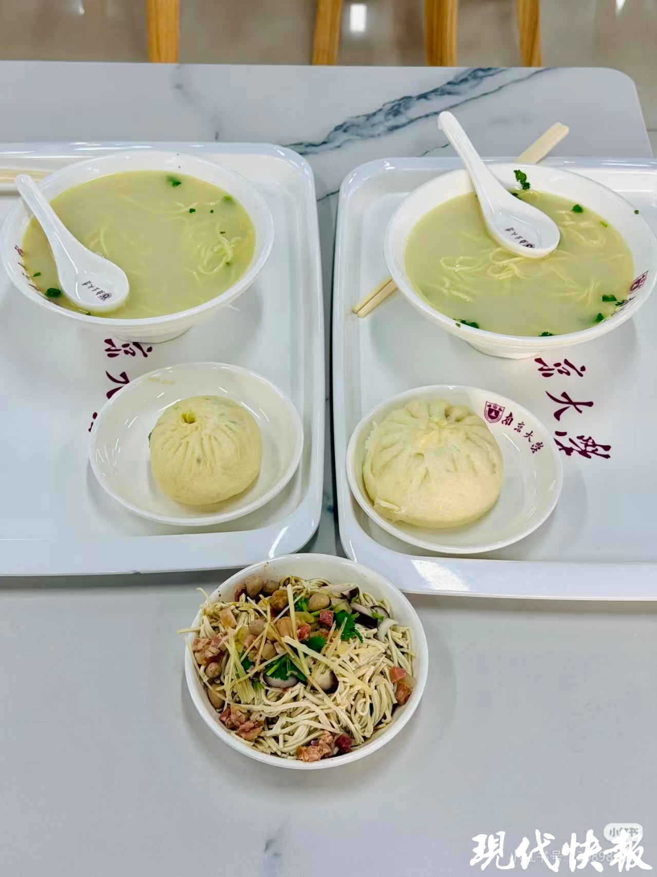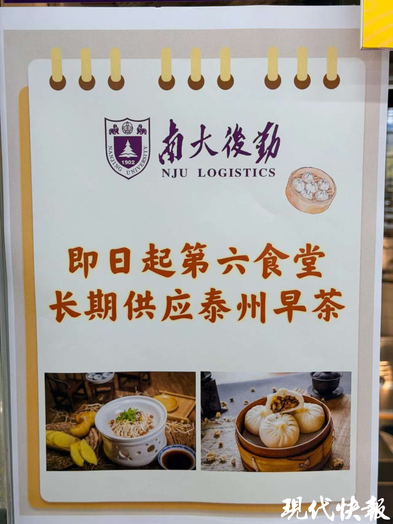 现代快报讯(记者 刘媛)好消息!苏超冠军泰州后劲大,泰州早茶进驻高校了!近日,南京大学仙林校区六食堂上新了泰州早茶,并且会长期供应,不少同学早起排队打卡,直呼南大早茶又多了新欢,12元套餐就能吃到撑!
