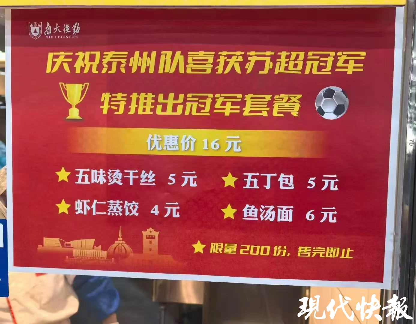 据了解,11月1日—3日,为助力在南京大学举办的“挑战杯”赛事,南大仙林校区六食堂将泰州早茶请进校园,深受师生喜爱。为庆祝苏超泰州队夺冠,食堂还特别推出了限量200份的泰州早茶“冠军套餐”,以亲民的16元价格,将地道的泰州早茶“搬”进了大学,套餐内含四道“灵魂菜品”:五味烫干丝、五丁包、虾仁蒸饺、鱼汤面。为吃上泰州早茶,不少同学懒觉都不睡了,早起排队打卡,食堂窗口排起长龙,泰州早茶成为南大食堂的“爆款”。