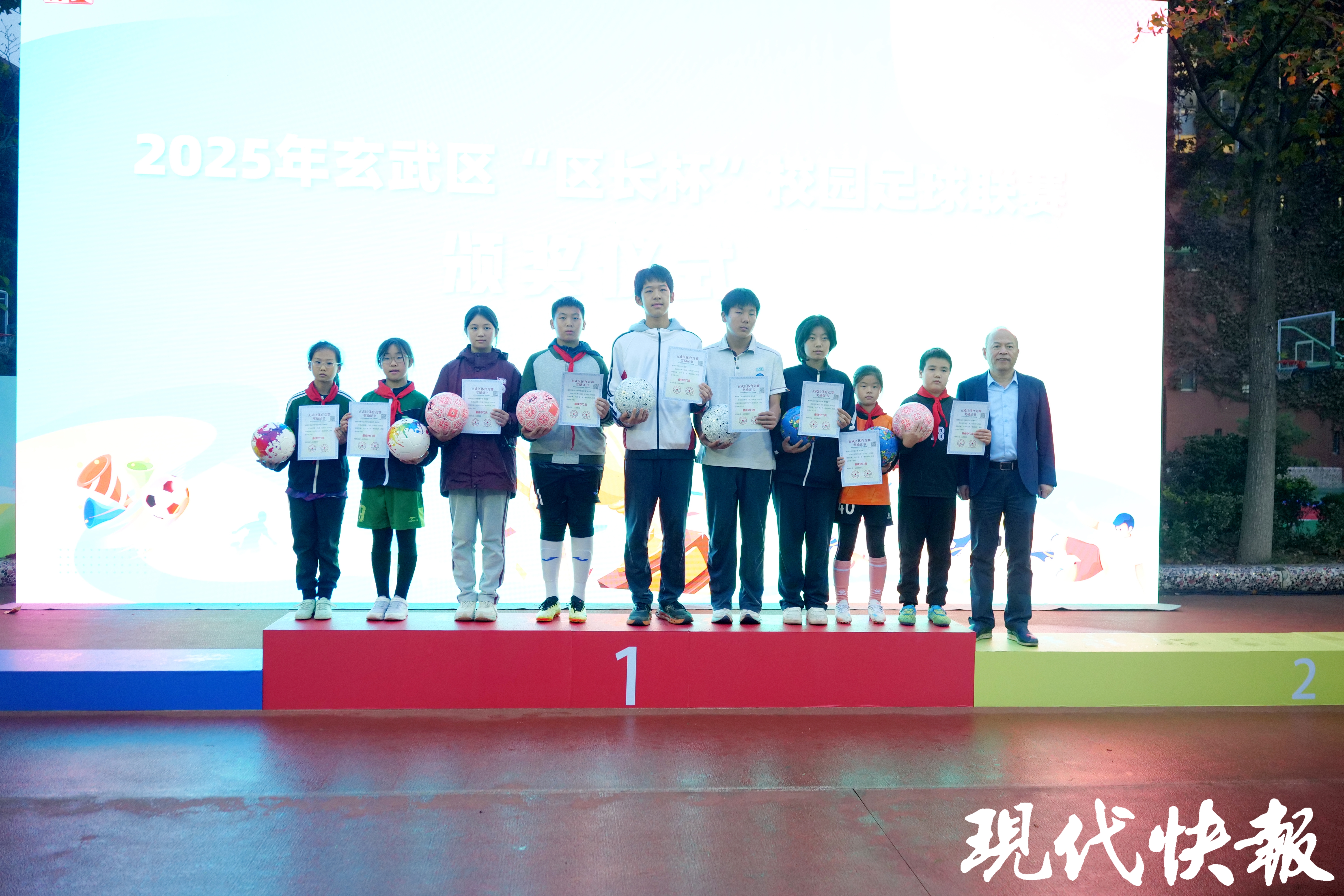 “区长杯”颁奖环节将气氛推向高潮。本届联赛吸引36所学校80支队伍近1000名球员,历经145场激烈角逐。玄武区委常委、常务副区长庄佳峰,区委教育工委书记、区教育局局长张恒柱、一级调研员沈峰为小学混合组、初高中男女子组等9个组别冠亚季军颁奖,“最佳射手奖”“最佳守门员奖”同步揭晓,获奖队员收获苏超球员签名足球,这份荣誉既是对热爱的嘉奖,更是对拼搏精神的肯定。赛事采用“周末赛与周中赛相结合”模式,7所赛点学校联动承办,让足球激情覆盖更多校园。