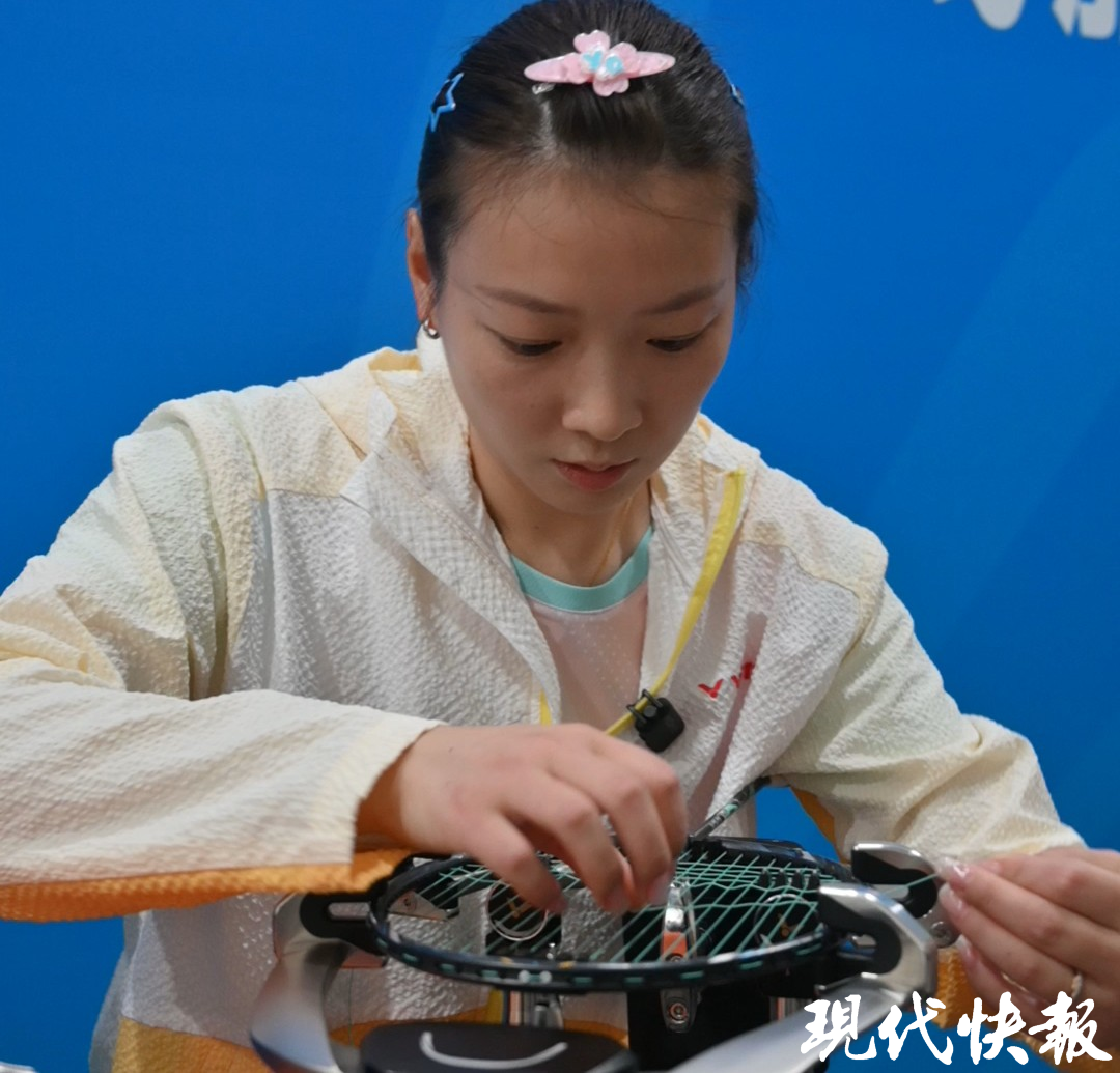 开赛前,郑思维为比赛测球速,尽管他已经参加了三届全运会,但这样的经历还是首次。比赛间隙,他们还在穿线区体验穿线,展示了各自的穿线“童子功”。本次全运会的官方指定穿线服务由威克多的VPS专业穿线师团队提供。作为十五运会官方指定体育器材类(羽毛球)独家供应商,威克多还为羽毛球比赛提供场地器材和比赛用球。