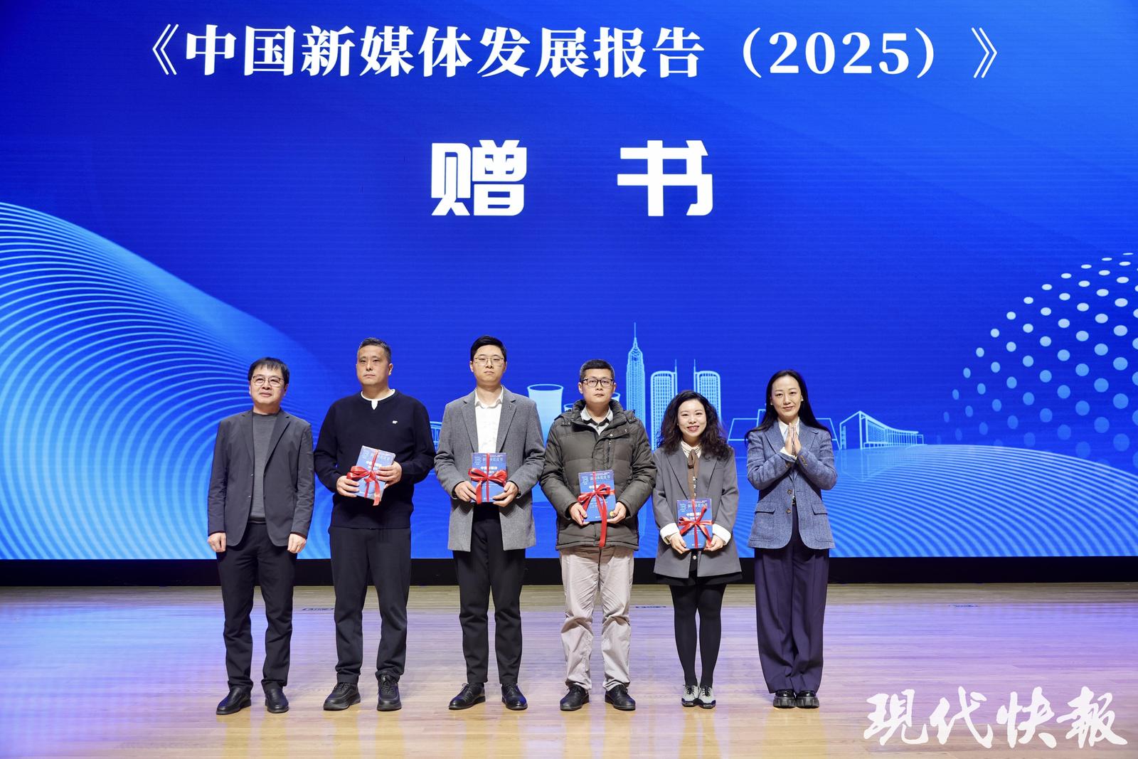 新书发布后,现场举行了赠书仪式。现代快报社总编辑郑春平、中国视协市县融媒专业委员会副主任张敏共同向高校师生、媒体代表赠送了《中国新媒体发展报告(2025)》。