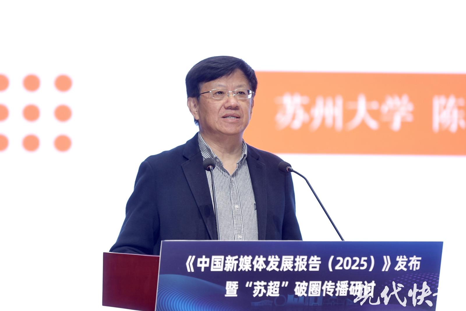 苏州大学新闻传播学院院长陈龙在题为《从“苏超”破圈传播解码主流媒体系统性变革路径》的分享中表示,在技术快速发展的当下,“苏超”可谓一朵媒介化的“浪花”。“苏超”破圈传播的背后,绝非偶然的流量爆发,而是主流媒体在内容生产、机制架构、技术应用、生态构建等多维度系统性变革下的必然结果。