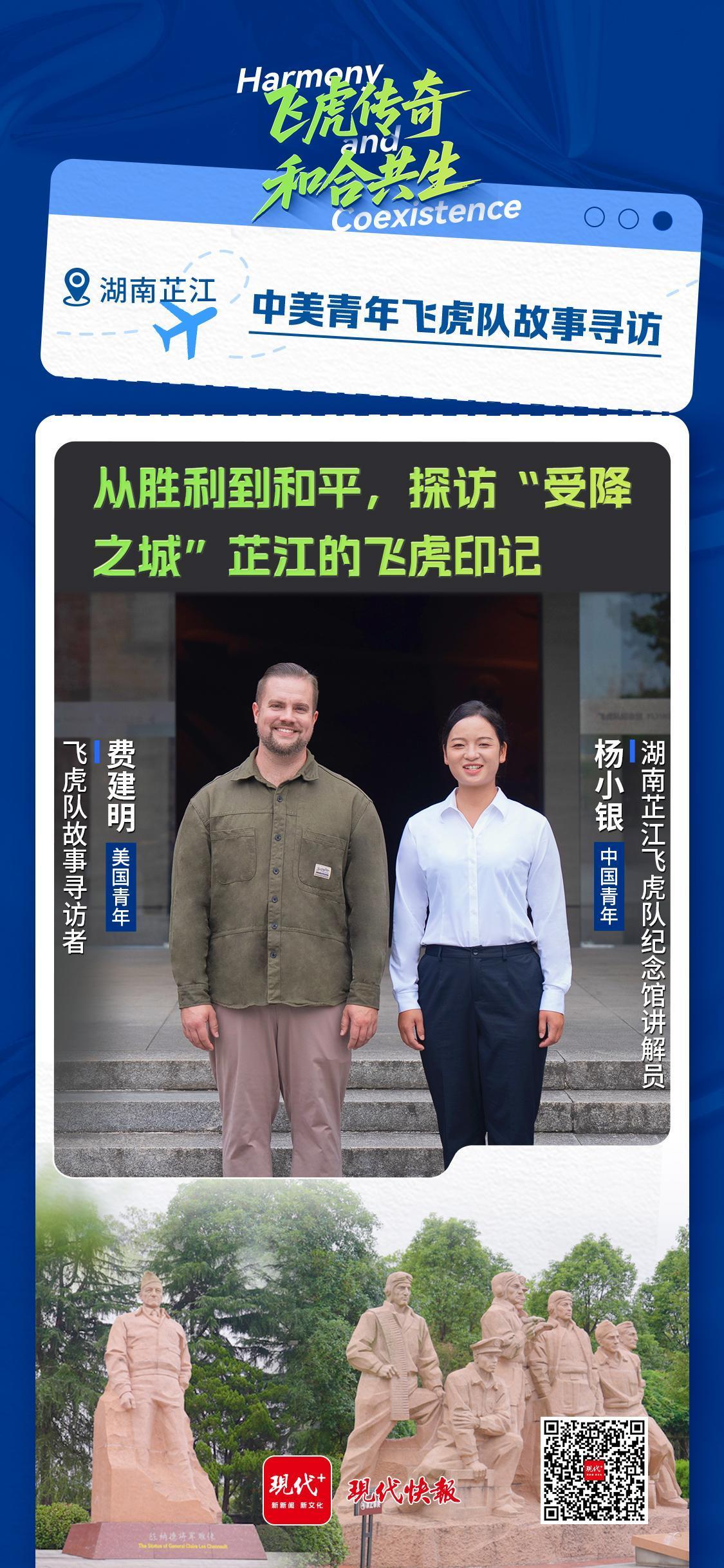 近日,由现代快报发起的“和合共生——中美青年飞虎队故事寻访”活动启动,面向全球招募中美青年参与寻访。美国青年费建明(Jim Fields)在中国生活了16年,他对飞虎队的历史故事充满兴趣,致力于成为一名飞虎队故事传播者,曾走访昆明、成都等多座与飞虎队有关的城市。2025年9月,费建明跟随中国青年、湖南芷江飞虎队纪念馆讲解员杨小银的脚步,走进湖南怀化芷江,共同探寻飞虎队记忆,传递和平与友谊。