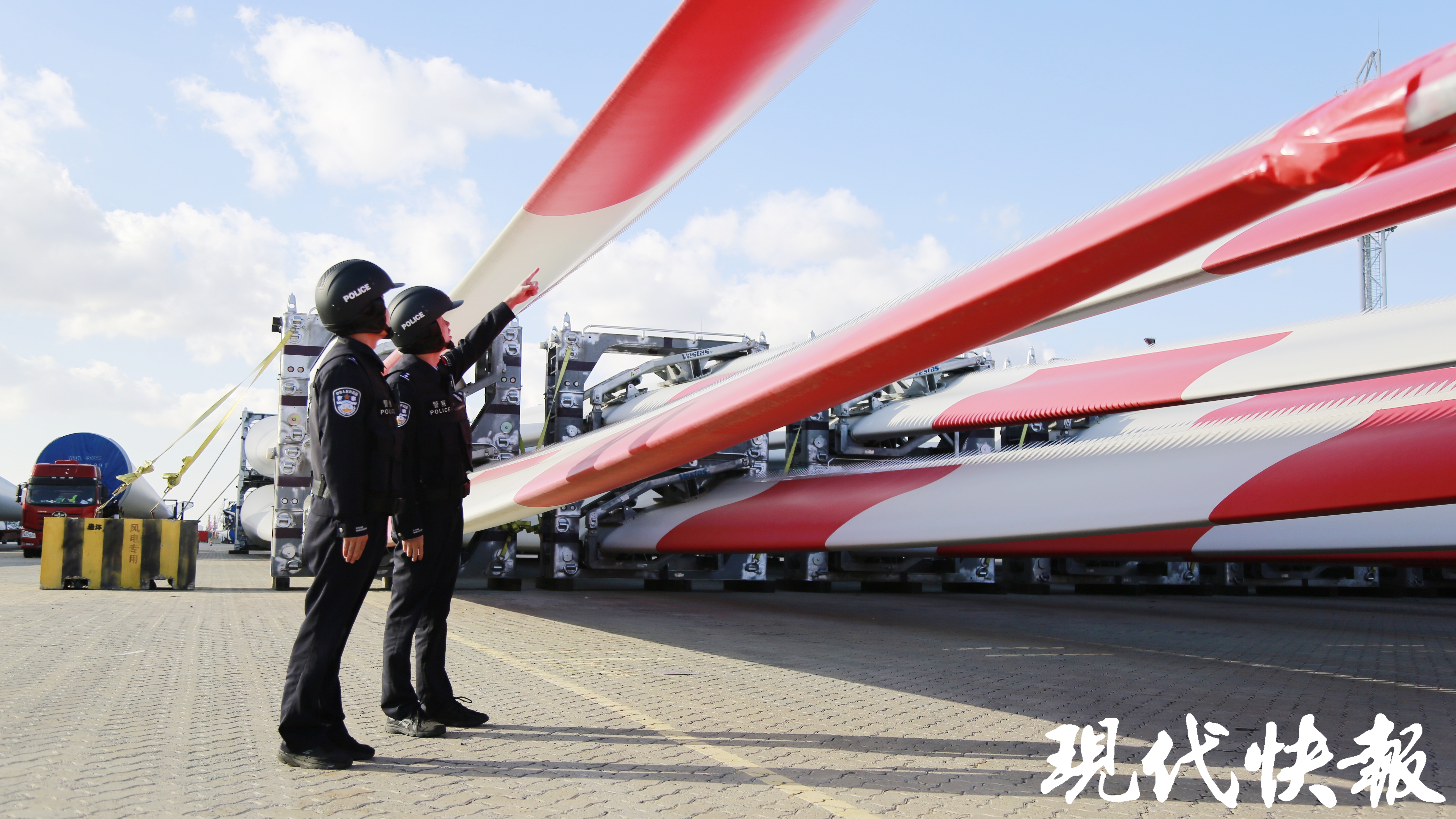 在繁忙的连云港码头,连云港边检站民警庄智凯正在外轮边上巡查,他指着即将出港的风电叶片说:“这些风电叶片体型巨大,安全装运和快速出关直接关系到企业的运营成本和商业信誉。”他们平时及时了解企业需求,解决实际困难,全力保障产业链供应链畅通。