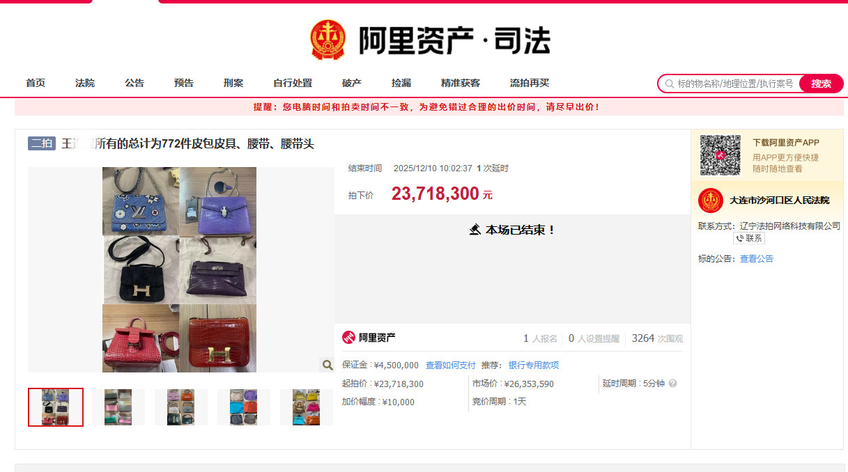阿里拍卖页面载明,此次拍卖的标的物为王某某所拥有的772件皮具,包括各式皮包、腰带及腰带头。此次拍卖的起拍价为2371.83万元,竞买人需要缴纳的保证金,就高达450万元。此次拍卖活动由大连市沙河口区人民法院主持,拍卖时间为2025年12月09日10时至2025年12月10日10时止。