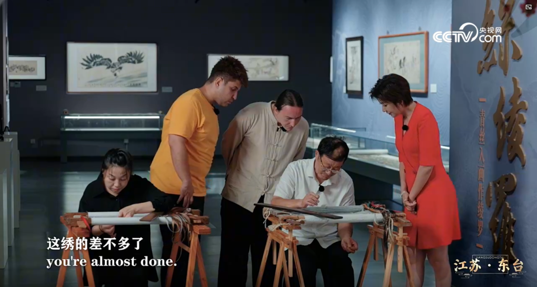 在盐城西溪的发绣馆内,外国青年们在国家级非物质文化遗产“东台发绣”代表性传承人陈伯余老师的指导下,亲手触摸非遗技艺的细腻纹路,感受盐城传统工艺的匠心传承。漫步草市街与犁木街,一碗鲜醇的东台鱼汤面、一杯醇厚的陈皮酒,不仅是舌尖上的盐城滋味,更藏着古镇百姓的热情好客与宁静恬淡。