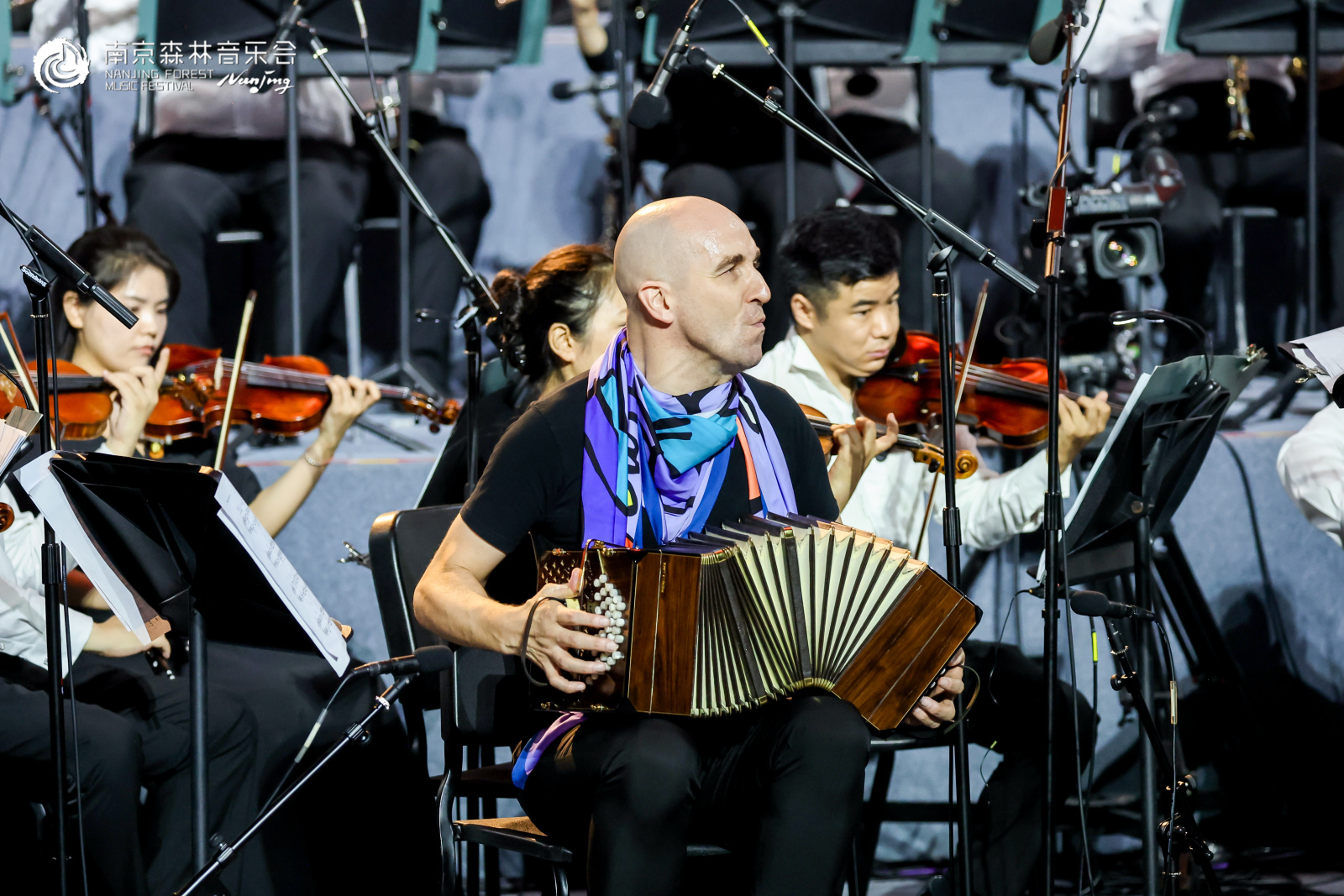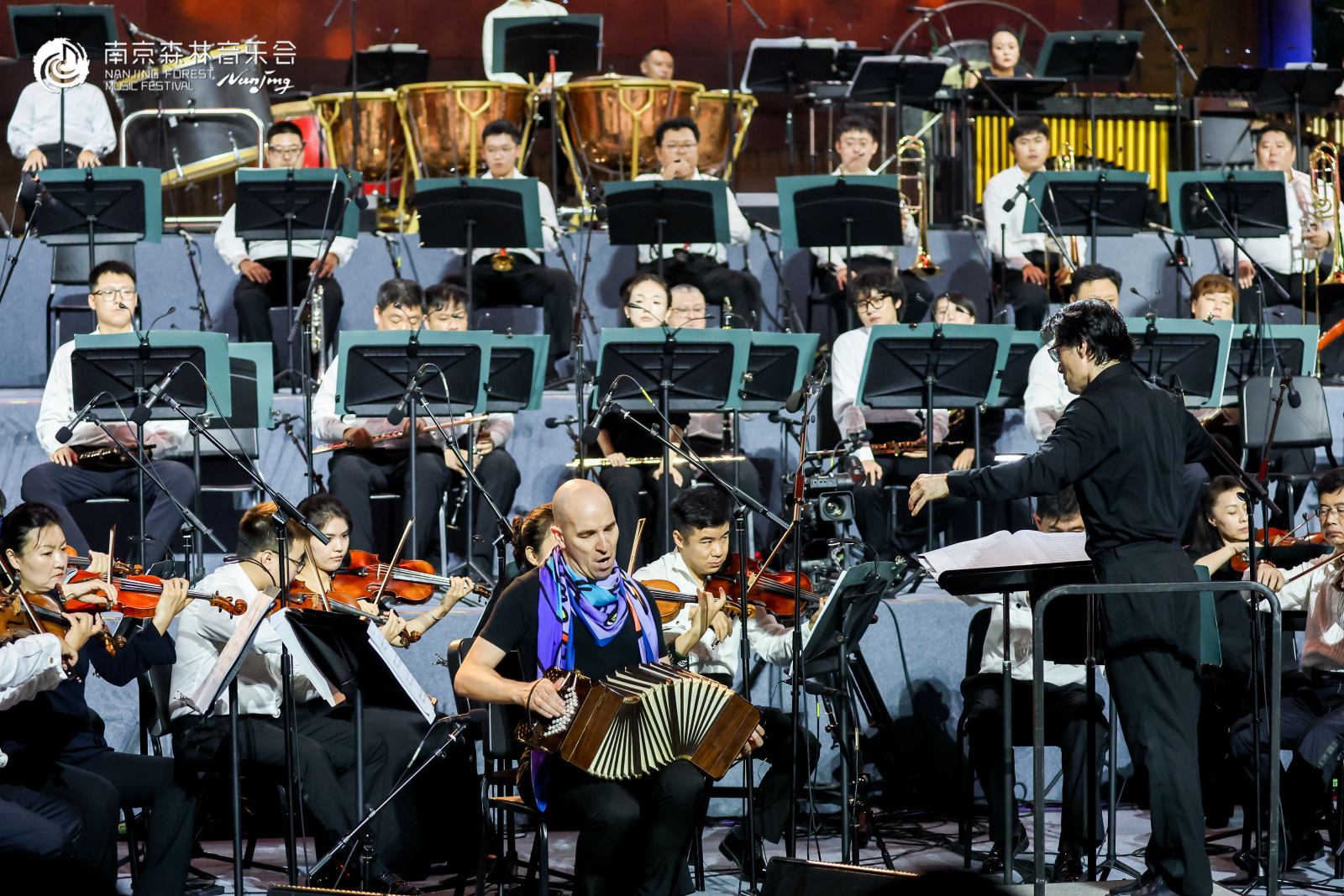 在令人熟悉、又充满着新鲜的探戈味儿的《野蜂飞舞》的返场声中,全场气氛达到高潮。急促旋律骤然响起,马里奥・斯特凡诺・皮特罗达尔基再度携班多钮登场,乐器的独特音色与乐团弦乐、木管交织,似无数野蜂振翅掠过秋夜林梢,班多钮的灵动转音为乐曲注入别样活力,原本明快的旋律更添一层“蜂鸣”的鲜活质感。观众纷纷屏息聆听,待最后一个音符落下,掌声与欢呼声如潮水般漫过音乐台,与月光交织成中秋夜最热烈的“森林交响”。