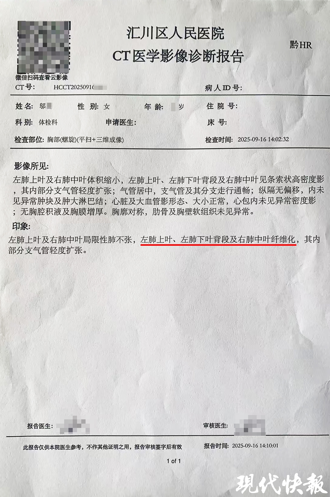 其间,邬女士按照贵州珍酒要求,在当地医院进行了体检,结果显示肺部有纤维化。“因为我2021年患过肺结核,就如实告知了公司,但治愈后每年都定期体检,而且没有复发过。”她回忆说,9月22日,贵州珍酒人力资源告知因为其肺结核病史,不予录用。