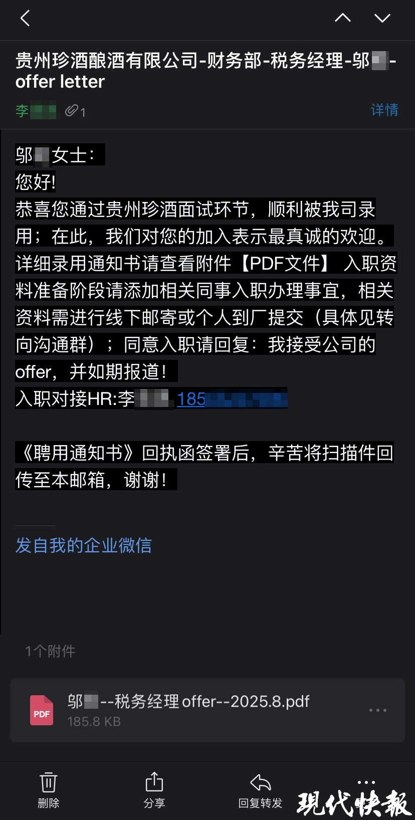 邬女士是云南昭通人,此前在山西一家单位上班,其间因为表现优秀,被派遣出国工作。她说:“今年8月,有猎头向我推荐了贵州珍酒,后来经过线上线下一共4轮面试,8月下旬,我收到了贵州珍酒人力资源的offer。”
