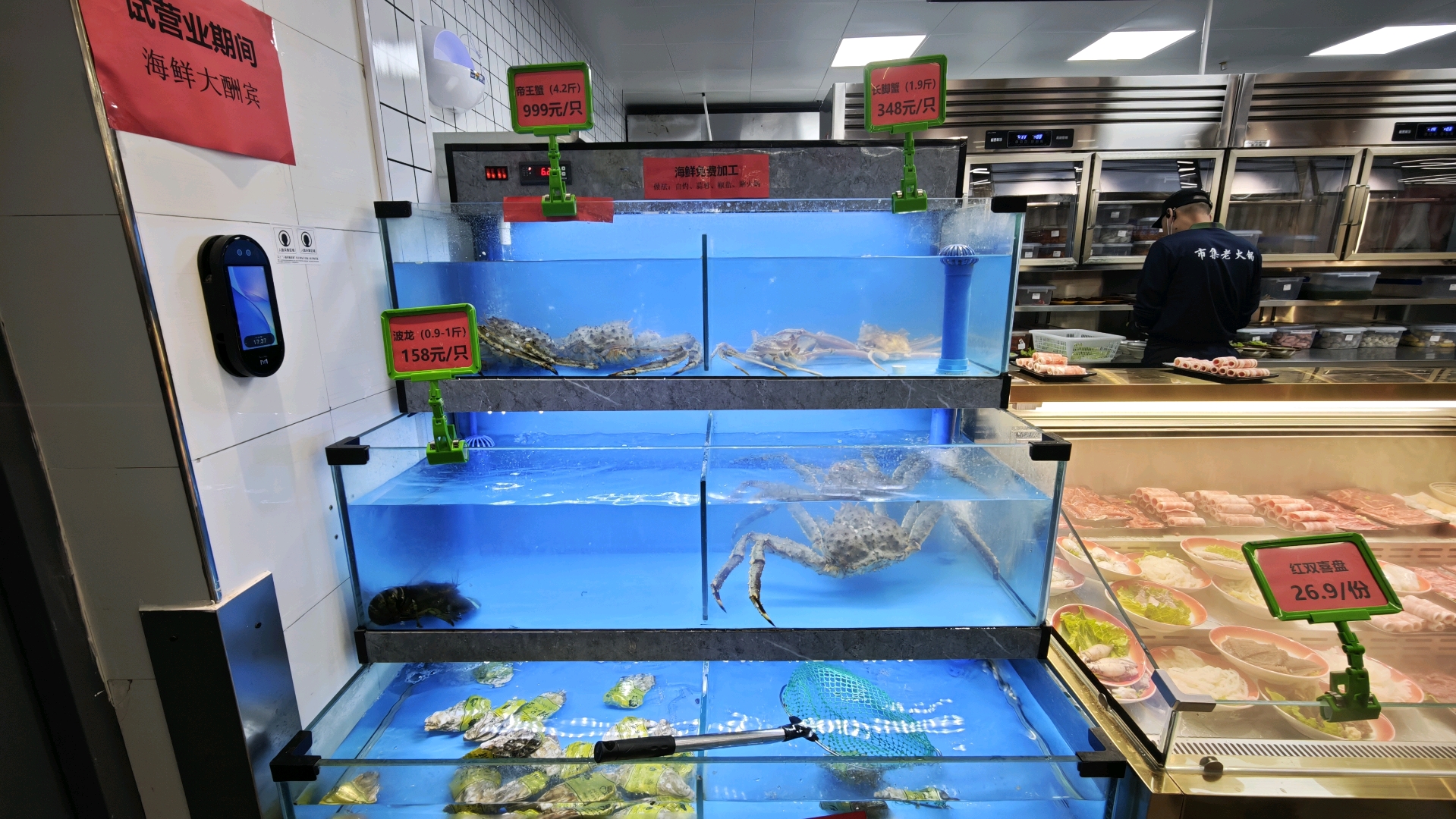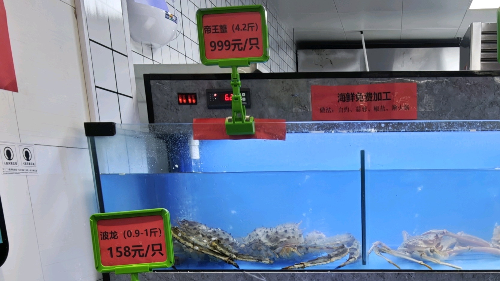 现代快报讯(记者 刘赟)11月3日,“高校食堂卖999元帝王蟹”的话题冲上热搜。当天下午,现代快报记者来到南京大学第九食堂,在其中一家档口的侧面摆放着几个水族箱,里面除了有帝王蟹,还有波士顿龙虾、长脚蟹、生蚝等海鲜。其中帝王蟹(4.2斤)999元/只,波士顿龙虾158元/只,可以选白灼、蒜蓉、椒盐等烹饪方式。该档口负责人表示,帝王蟹是从11月1日起开始供应的,目前来看应该会长期供应。“来预订的基本都是学生,这两天每天都有1—2只订出去,这会还剩3只,现在下单的话差不多要等一个小时。”