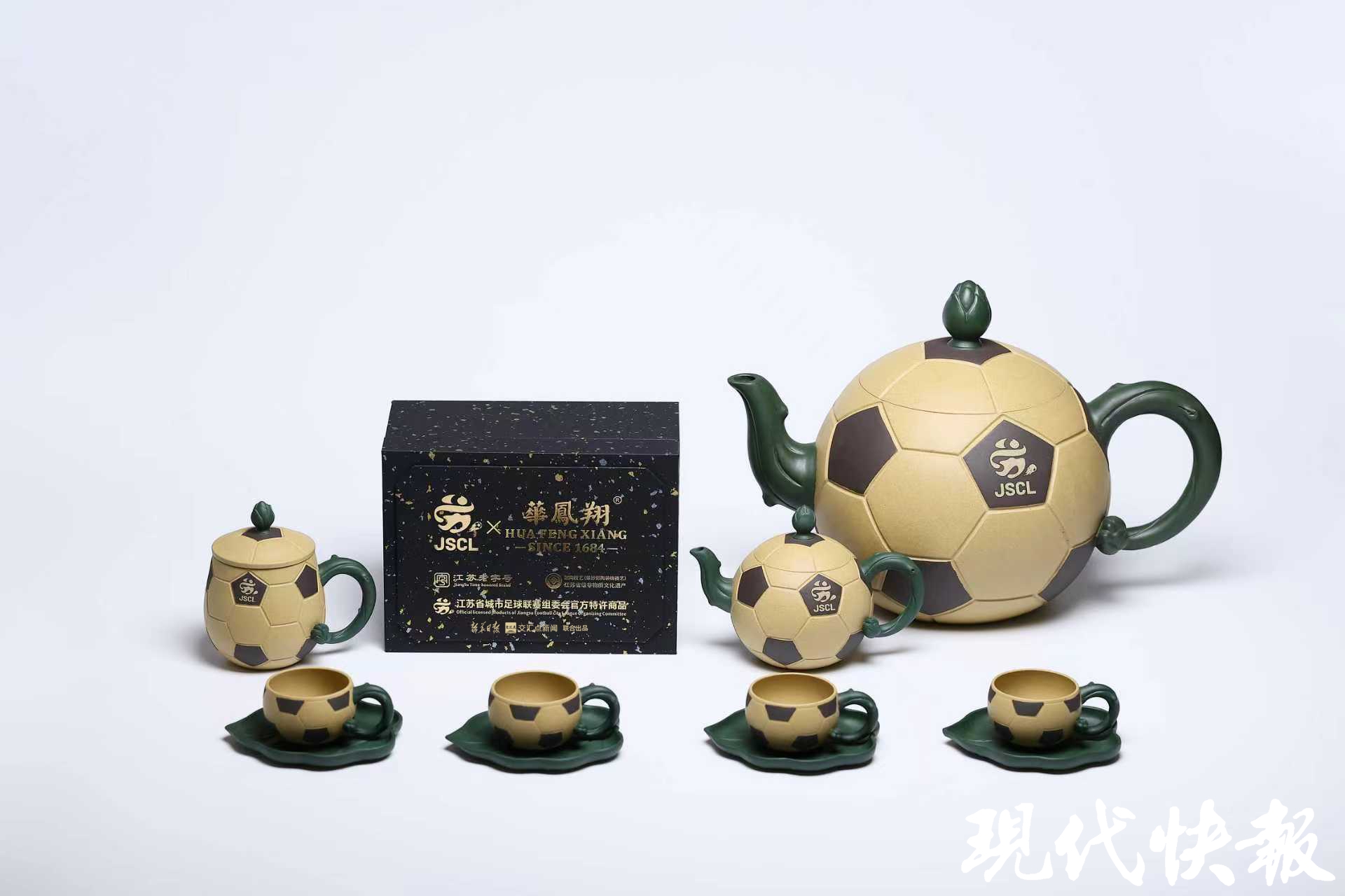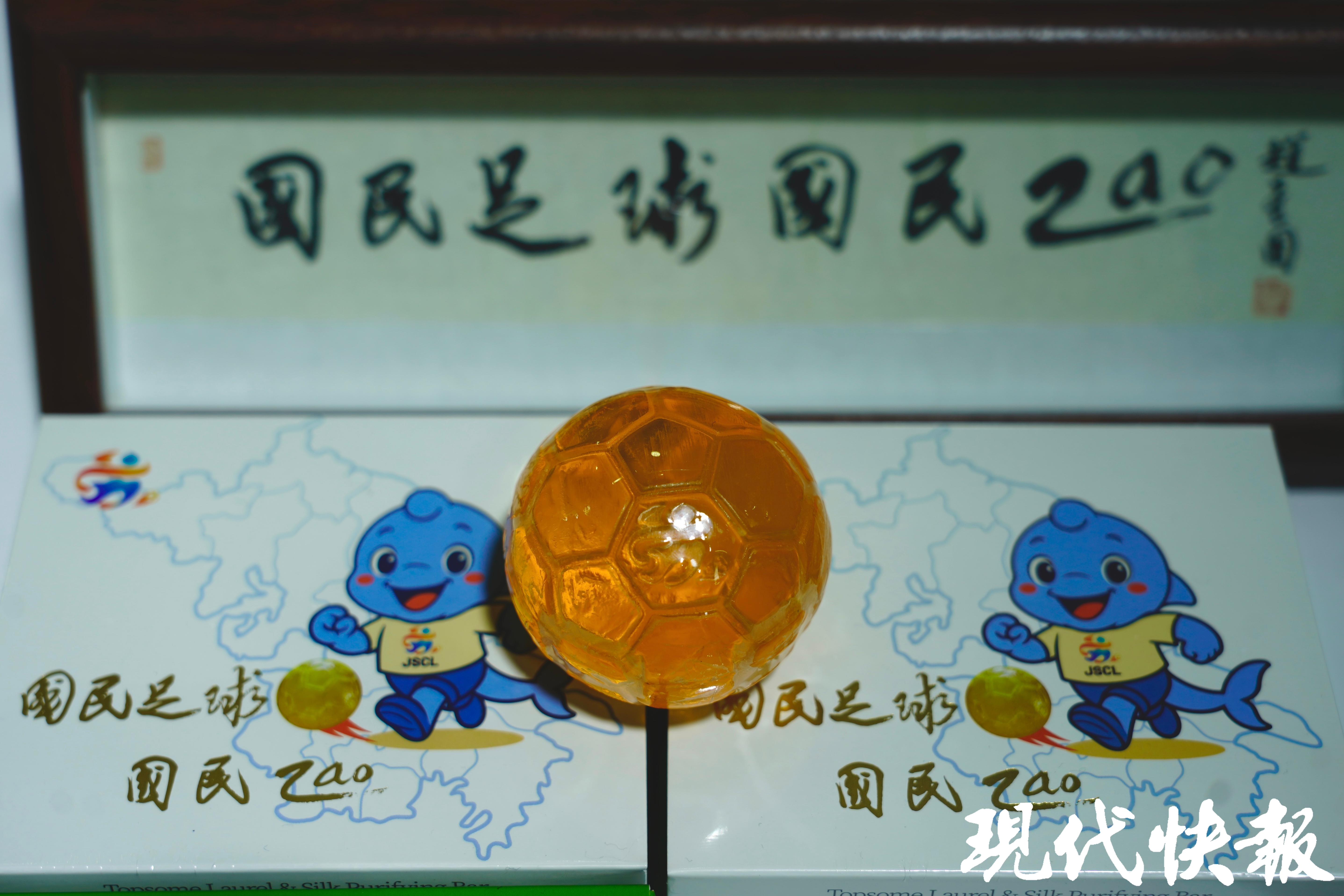 当文创迎来奇幻跨界。“今年苏超特别火,所以我们将苏超、紫砂、茉莉花三种元素融合为一体,打造了苏超之花足球紫砂壶套组。”江苏华凤翔董事长禹辰介绍,除了中间1:1大小的足球紫砂壶外,其他十三把壶融合了江苏13个市的风土人情,打造了特色紫砂壶,如南京梅花、无锡水蜜桃、泰州凤凰、南通桑叶还有苏州大闸蟹等等。南京正官庄电子商务有限公司带来的“同甡桂冠·足球皂”,肥皂净含量为“110g+13g”也有特别的寓意,“13”代表江苏13个市一起参与苏超,“100”则对应大家全力以赴的100分,可谓是“国民足球,国民zao”。