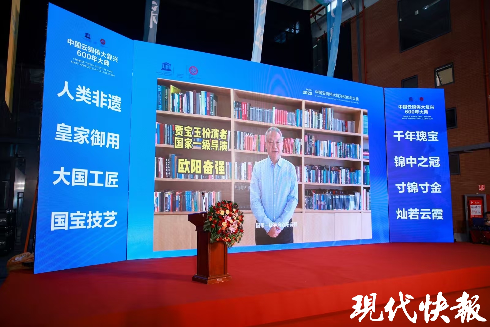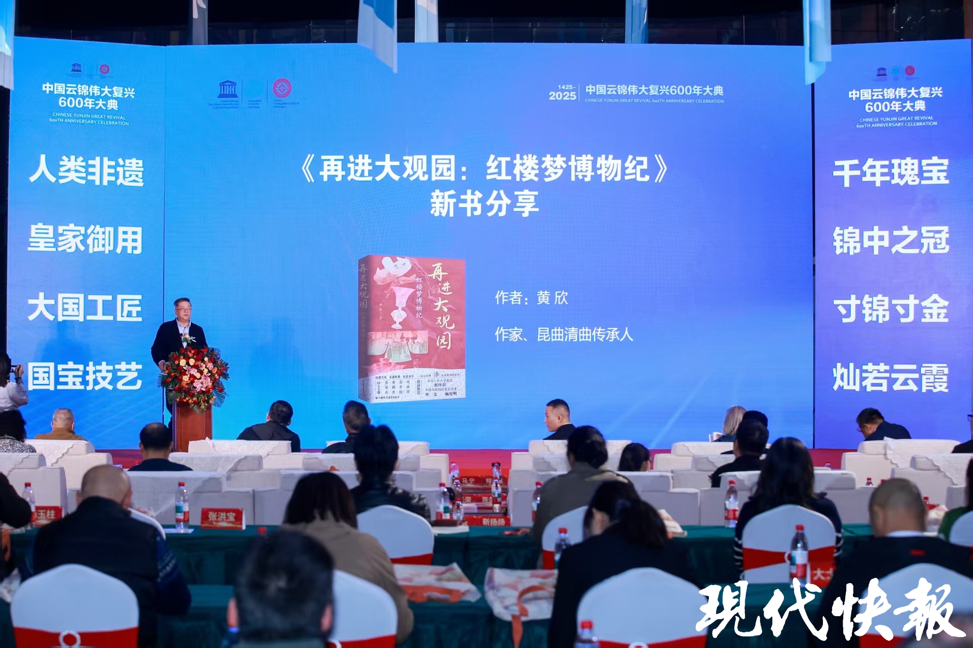 令人惊喜的是,“贾宝玉”扮演者欧阳奋强也以视频的形式“云聚首”,隔空致意,向观众普及云锦文化并推荐红学专家黄欣的新书《再进大观园:红楼梦博物纪》。