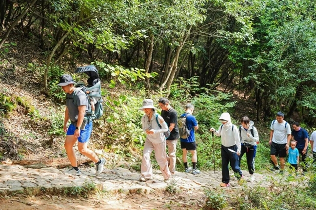 沿着步道拾级而上,空气瞬间清新起来。山林间,身穿冲锋衣、手持登山杖的年轻人络绎不绝。