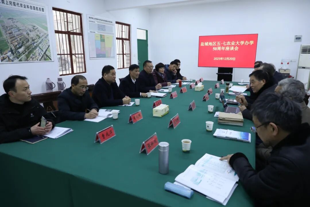 盐城地区五·七农业大学创办于1975年,是盐城地区第一所大学,其前身为创办于1952年的江苏省盐城农业学校。12月20日,盐城农业科技职业学院在上冈基地举行盐城地区五·七农业大学办学50周年座谈会。退休老教师代表倪同新、吴宏琪,75级及76级毕业校友代表盐城市农委原主任茆训东、江苏大丰麋鹿国家级自然保护区管理处原主任丁玉华、市委农工办原主任周广展,第九届、第十届全国人大代表姜德明,市农业农村局办公室原主任张如成,与校领导孙永龙、许为柏、宋孝春、束秀玉及相关部门同志齐聚一堂,共忆峥嵘岁月,共话母校情怀,共绘发展蓝图。