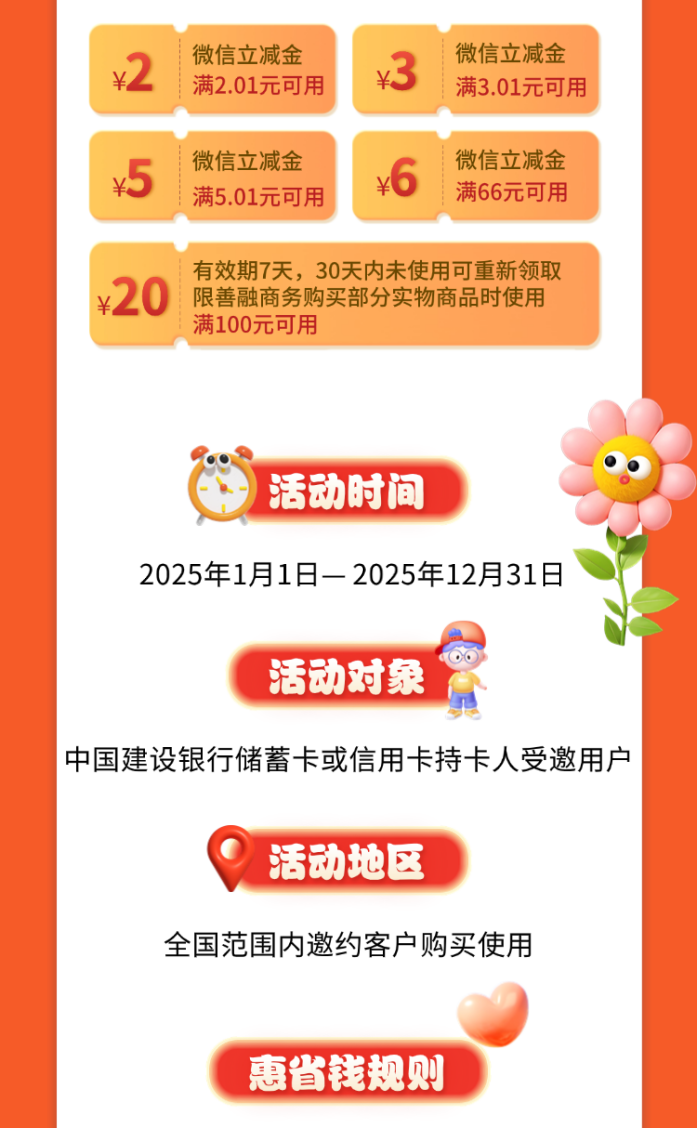 ①用户进入“惠省钱”活动页面抽取购买价格并成功支付页面显示的金额后,即可获得省钱卡券包,券包含5张总价值为36元的支付立減金,面额分别是2元(满2.01元可用)、3元(满3.01元可用)、5元(满5.01元可用)、6元(满66元使用)、20元(善融商务,满100元使用)。支付立减金种类根据用户购买时所选种类发放,其中面额为20元的支付立减金仅限在善融商务平台选择建行储蓄卡支付时使用,请在支付时确认支付页面金额,有优惠立减时再进行支付。