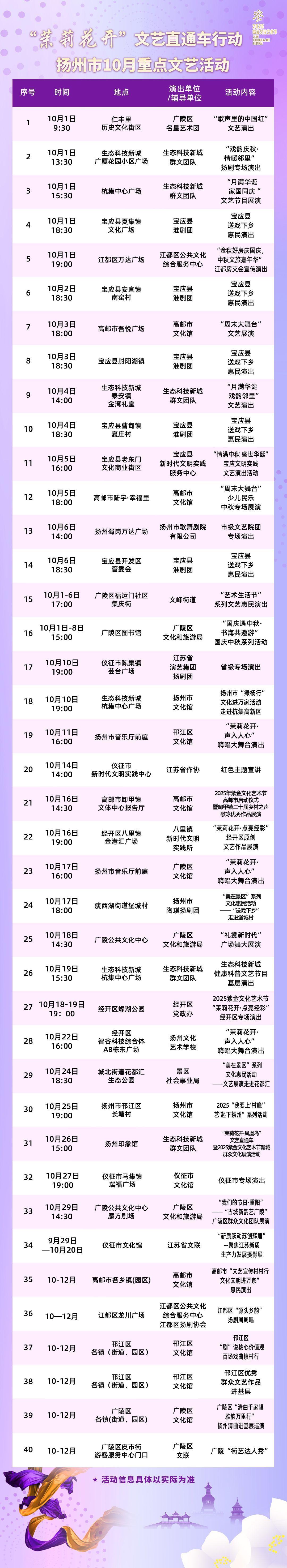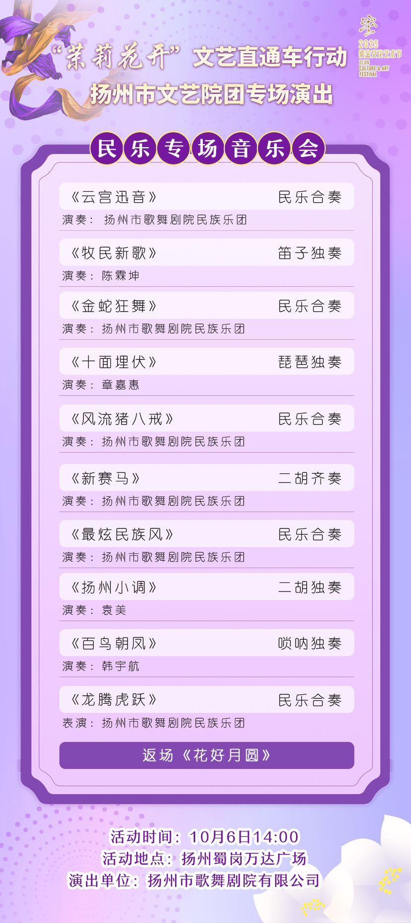 金秋十月,“茉莉花开”文艺直通车鸣笛启程,携手“2025紫金文化艺术节”,开启全新“扬州专列”!四大主题板块联袂登场,汇聚十大群文品牌,超百场惠民演出即将点燃全城文艺热情。艺术盛宴已就位,准备发车!