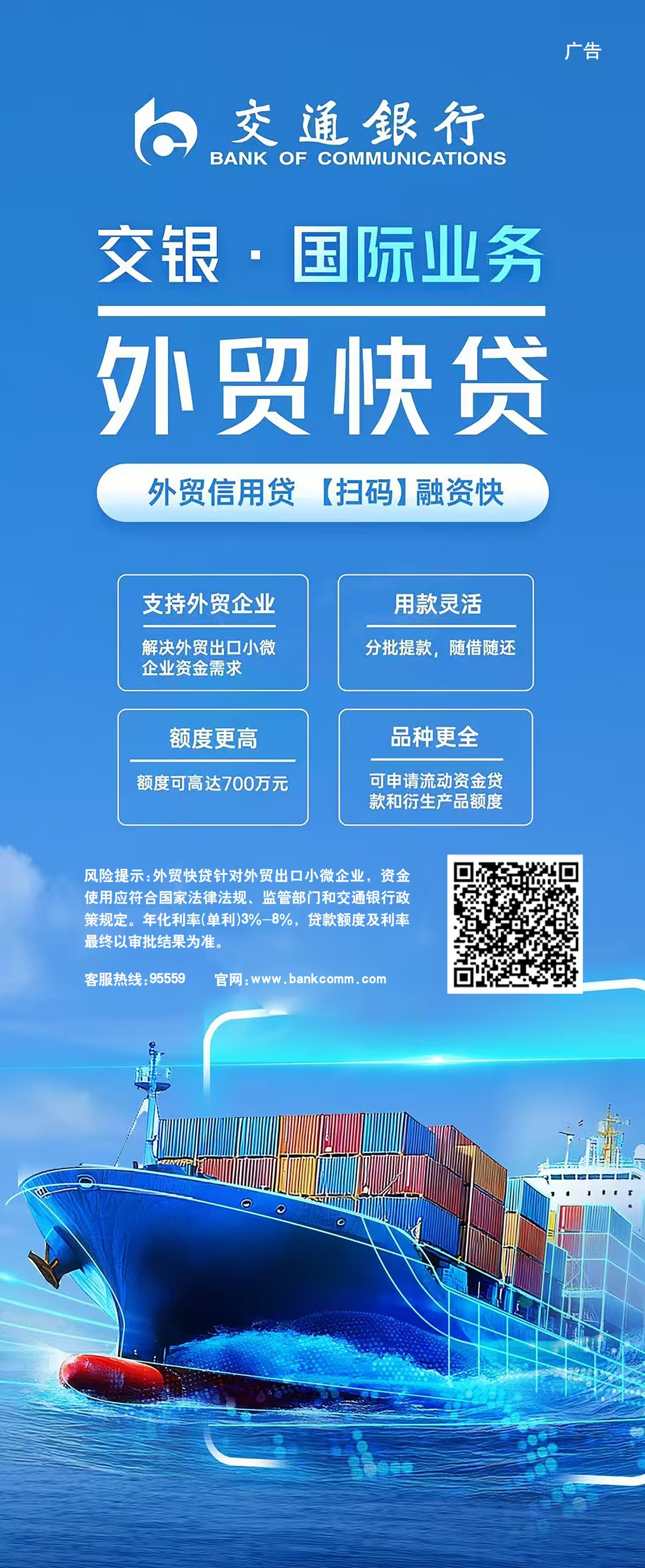 该企业财务主管感慨道:“‘外贸快贷’+‘远期签约’全程线上操作,不仅便捷高效,更解了我们的燃眉之急!”这笔及时雨般的资金与风险保障,为该企业抢订单、稳生产、拓市场提供了坚实底气。从融资到避险,交行“外贸快贷”产品以数字创新打通小微外贸金融堵点。上线首月,分行已为5户小微外贸企业提供超千万元贷款及500万衍生品额度。