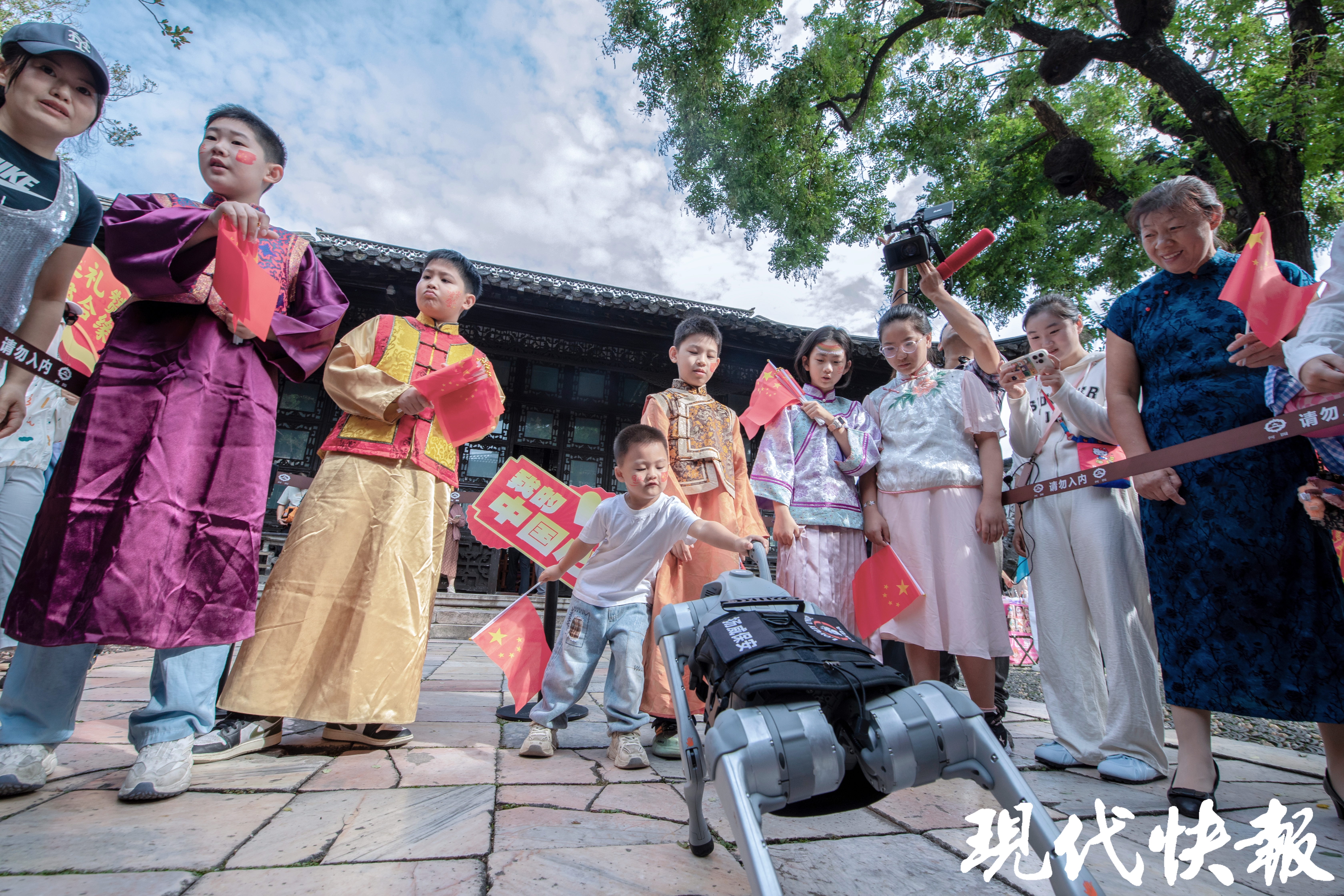 何园景区则举办了以“缘聚寄啸,双节同辉”为主题的系列活动,融合非遗、科技与志愿服务,为游客带来丰富的节日体验。活动亮点包括:“科技护园・萌犬献礼贺华诞”互动,游客可在船厅与Go2机械狗互动;“我与祖国同框”面部彩绘,留下独特节日记忆;小翰林志愿服务,在船厅协助维持秩序、传递国旗;“缘定何园・与国同庆”非遗婚书拓印,新人在玉绣楼体验传统技艺。此外,园区还设有非遗集市,让游客在感受科技魅力的同时,沉浸于传统文化的韵味之中。