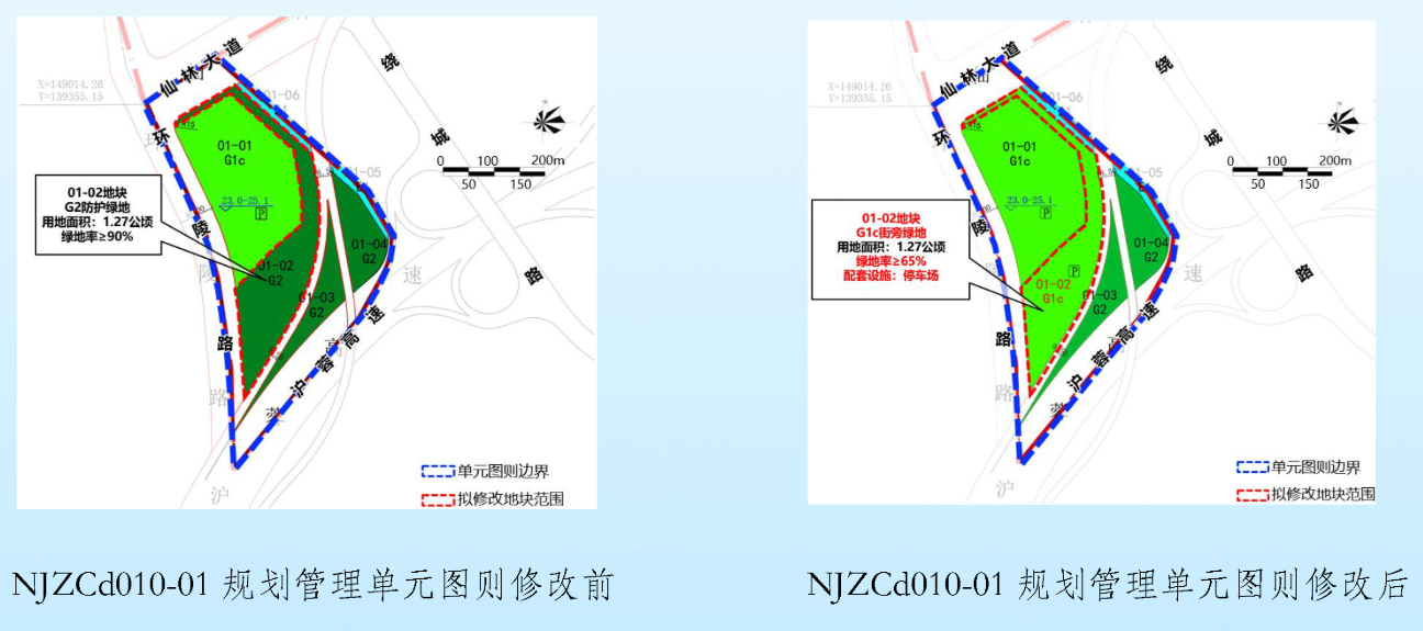 图则修改后,01-02地块用地性质由防护绿地(G2)调整为街旁绿地(G1c),绿地率由≥90%调整为≥65%,配套设施修改为停车场。新增控制条文:01-02地块可结合钟山风景名胜区东入口旅游配套设施布置停车场,沿沪蓉高速需预留30米退让距离。