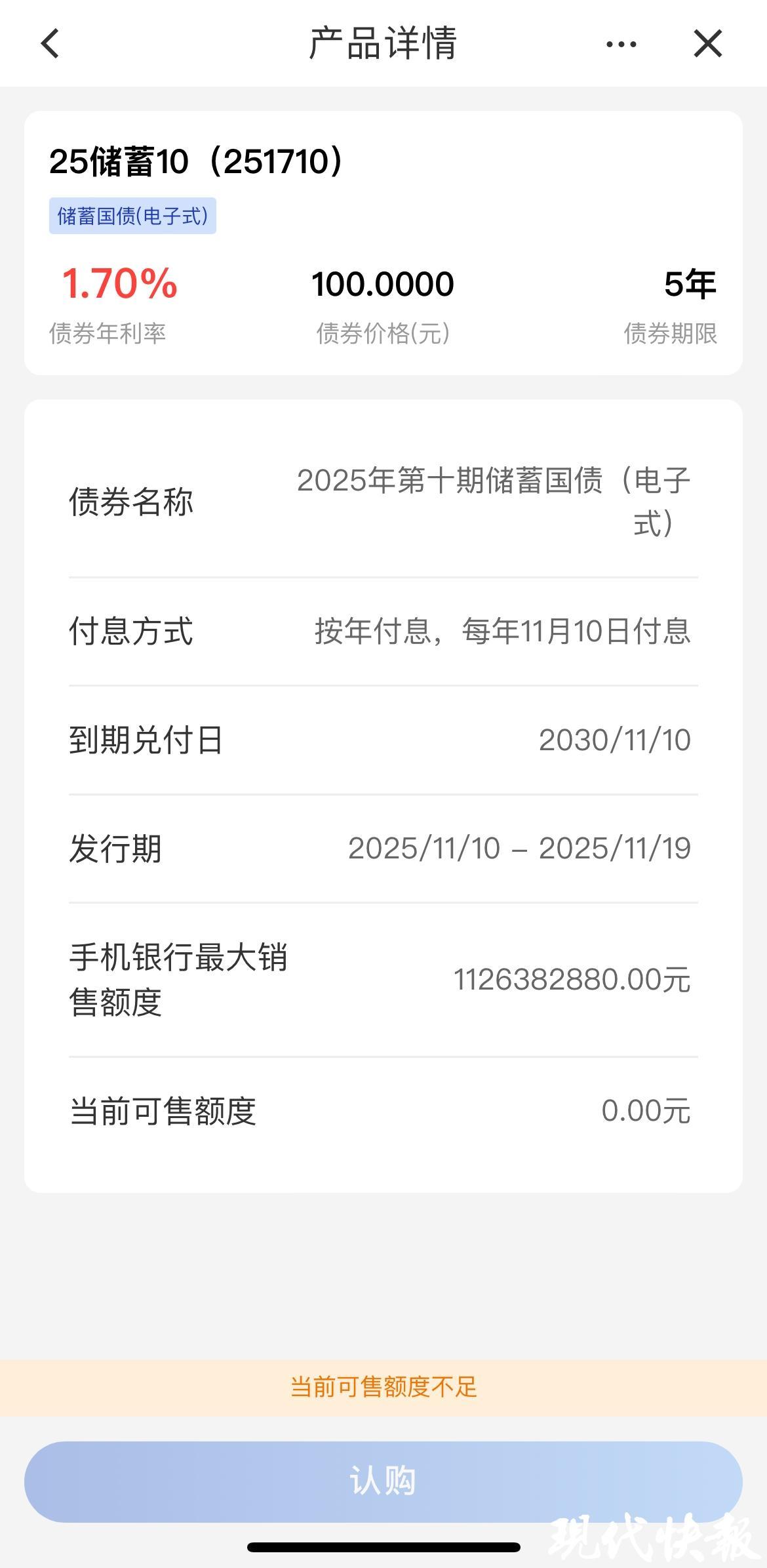 10日上午,记者通过某国有银行手机银行APP查询看到,开售仅半天,五年期储蓄国债(电子式)便显示“当前可售额度不足”。银行工作人员表示,后台额度已被抢购一空,不少投资者提前设置了开售提醒,线上渠道成为抢购主力。“五年期利率比三年期高0.07个百分点,且国债保本保息、安全性强,适合做长期资产配置。”一位银行理财经理告诉记者,近期资本市场波动较大,低风险、稳收益的储蓄国债成为稳健型投资者的首选,尤其是中老年群体和风险承受能力较低的投资者,纷纷将储蓄国债作为年末理财的重要选择。此外,部分银行针对储蓄国债认购推出了线上专属服务,简化申购流程,进一步提升了投资者的抢购效率。
