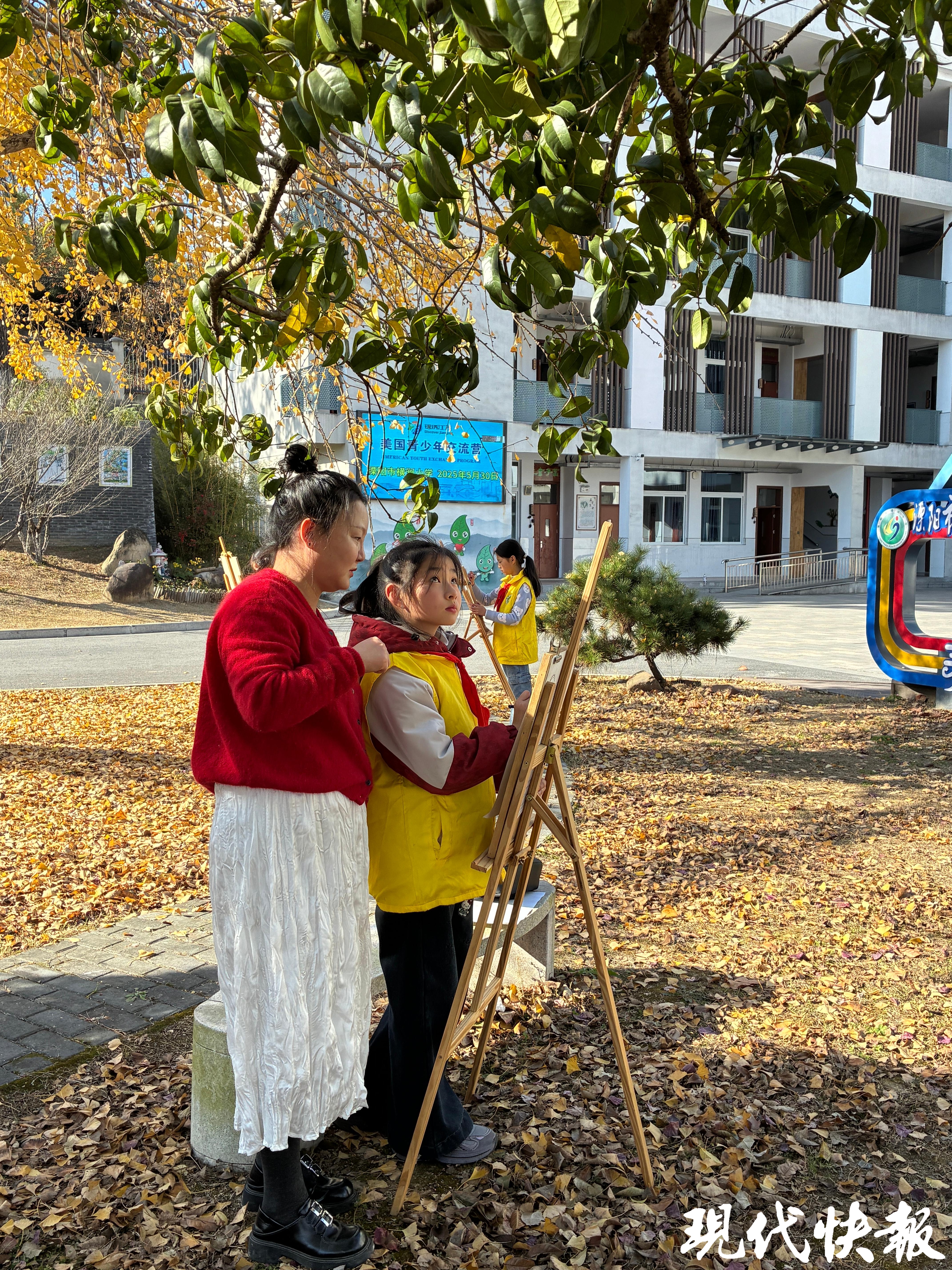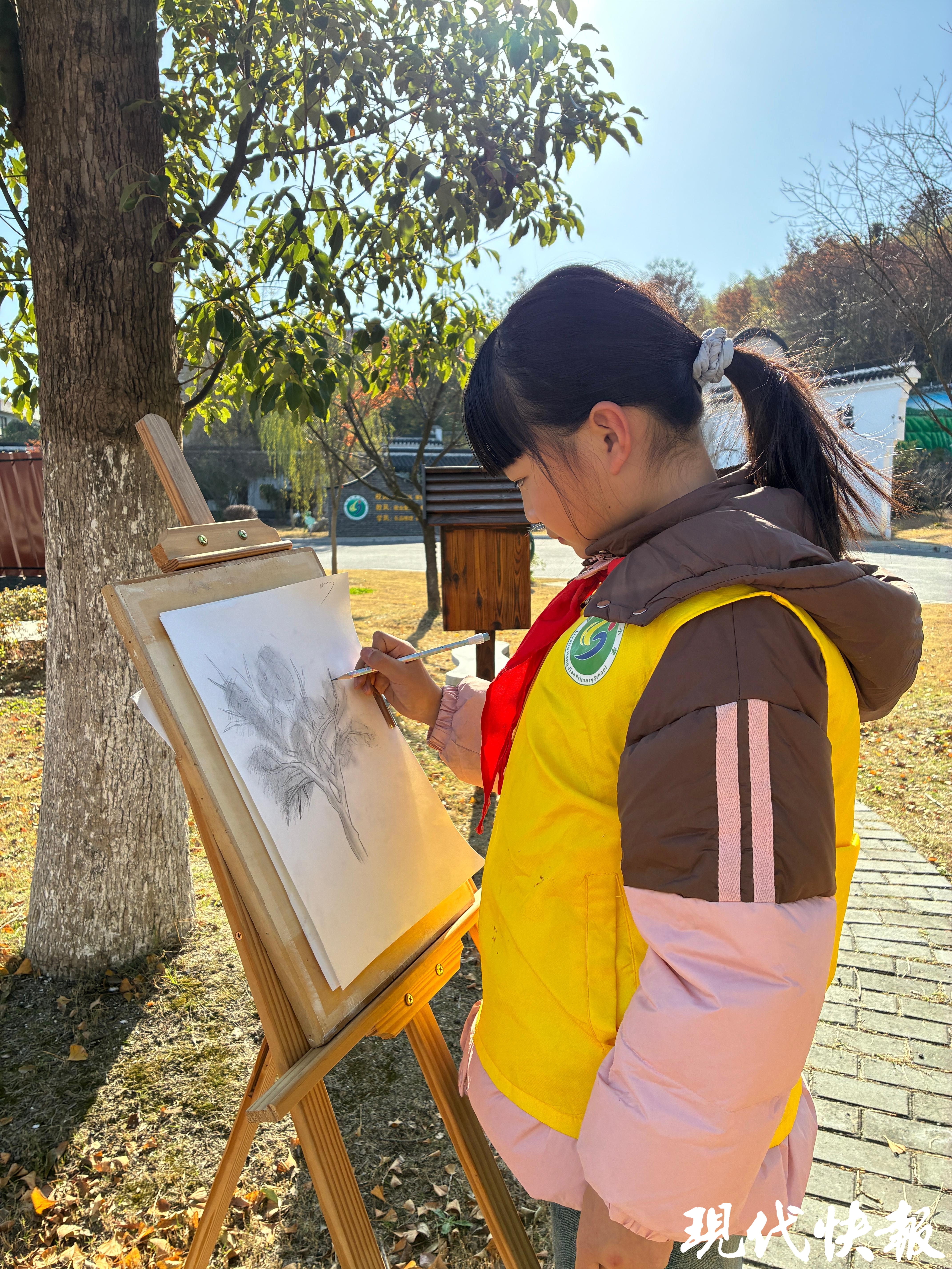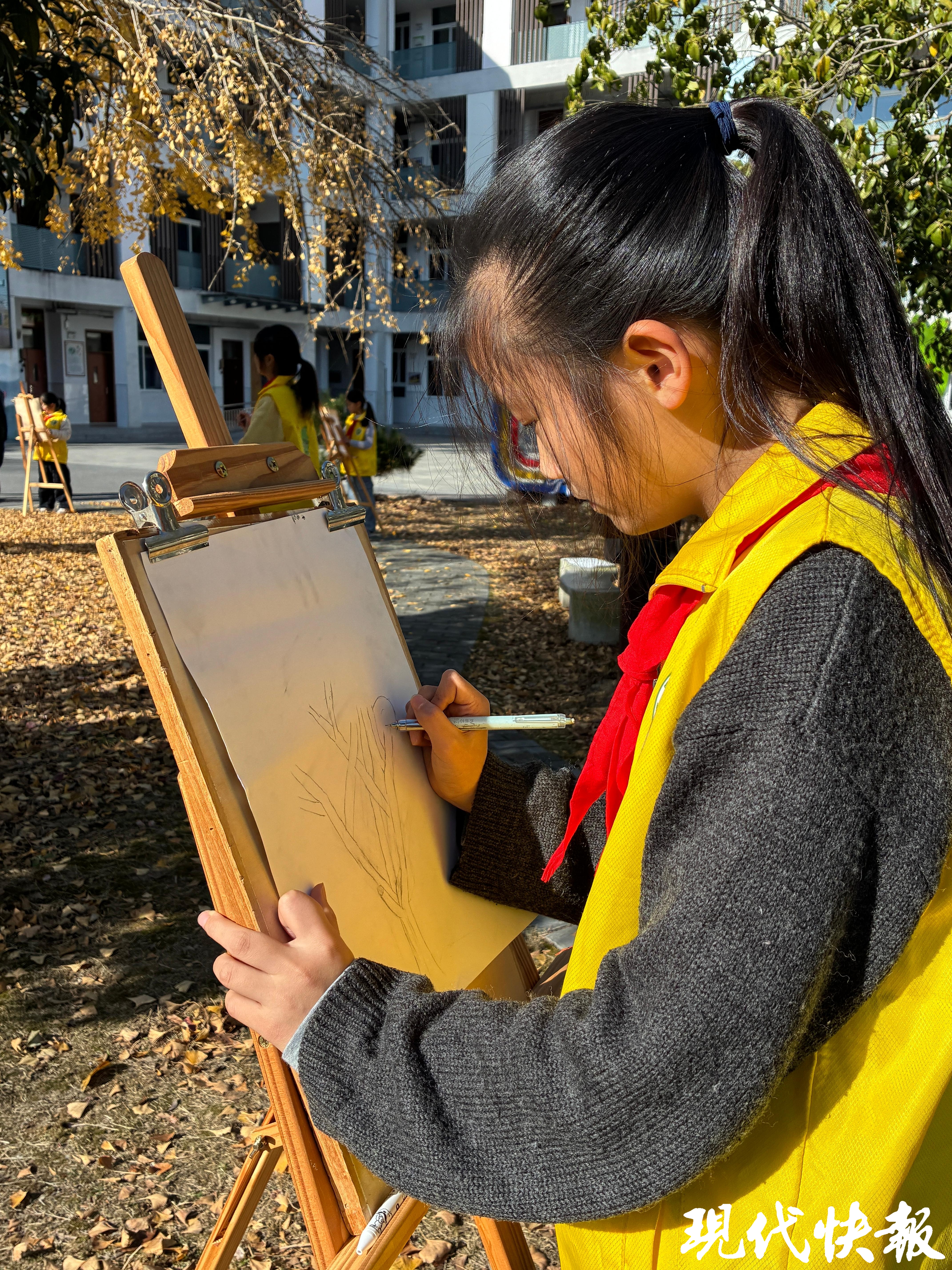 冬日暖阳,银杏树下,20余名学生正在校园里进行写生。这节别开生面的写生课,正是溧阳横涧小学松岭画院书画坊社团的日常缩影。