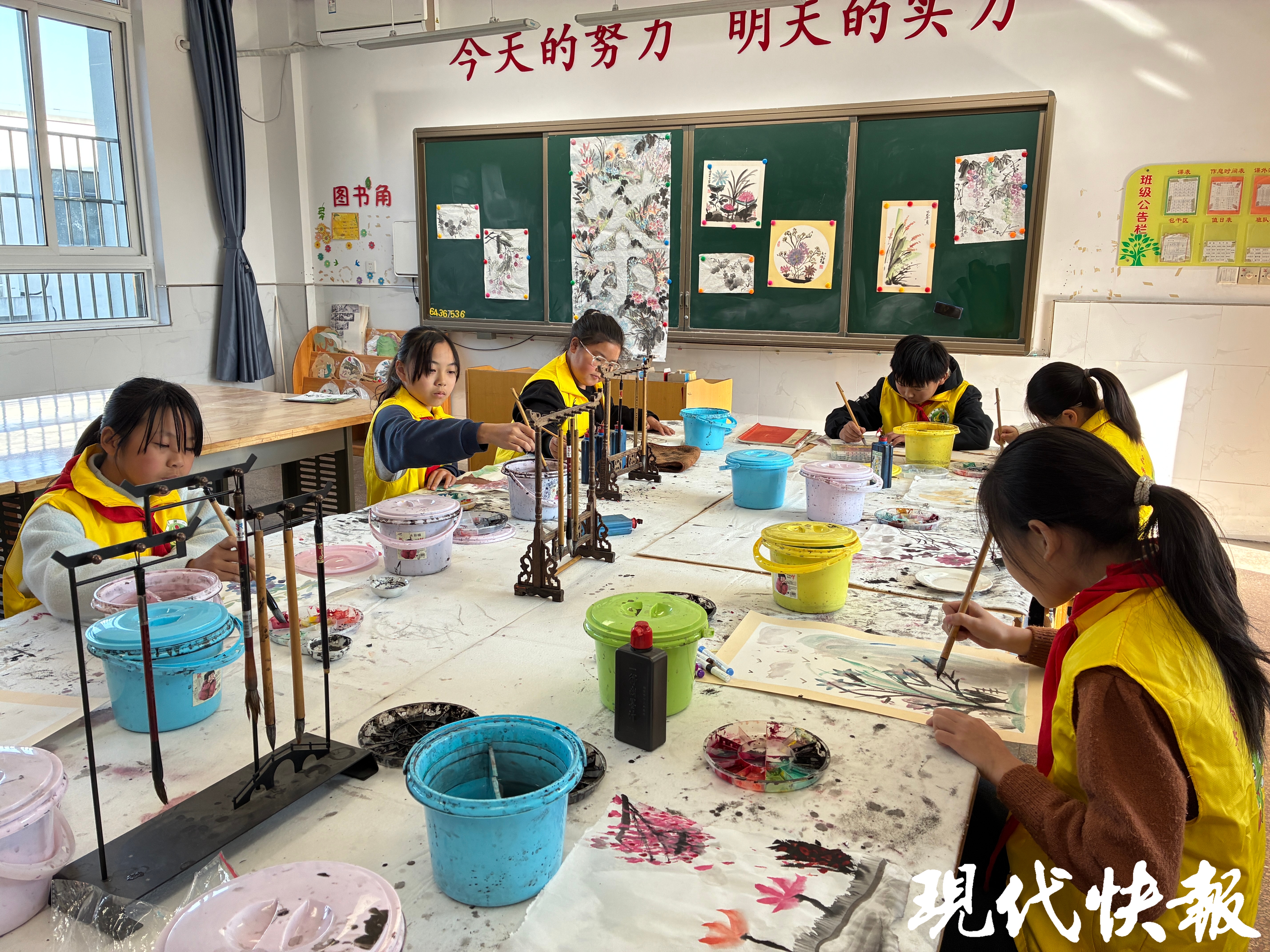 横涧小学位于天目湖南山片区,这所建在山坡上的学校因地制宜,深挖地域文化资源,在乡村学校少年宫成立松岭画院书画坊社团,培养学生的艺术感知与创作能力,将自然之美与艺术之韵融于笔墨之间,让美育之花在乡村校园悄然绽放。