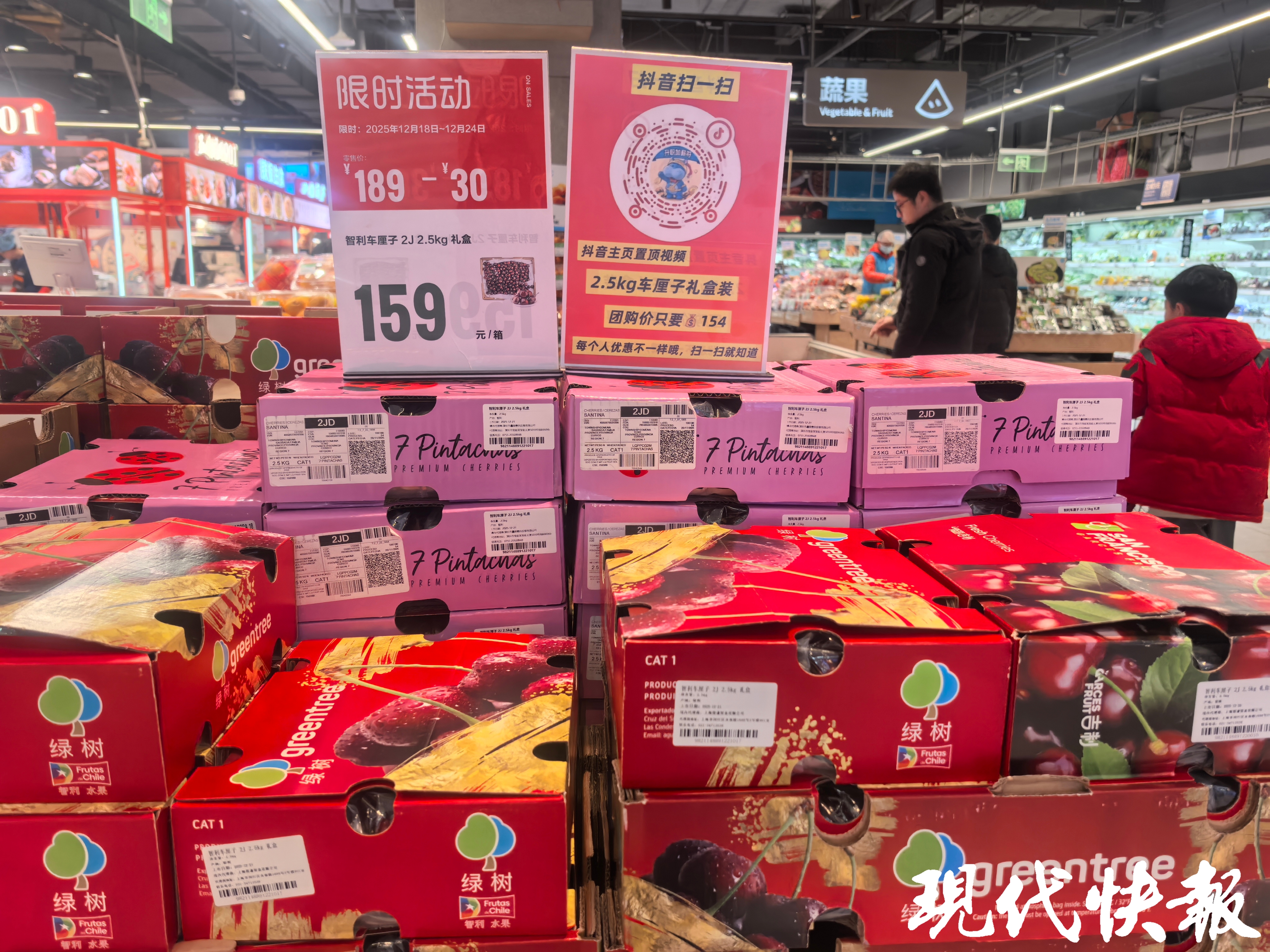12月23日,在一家连锁商超里,记者一眼就看到了堆叠整齐的车厘子礼盒:4J规格5斤装卖249元,算下来一斤近50元;3J规格一斤约40元。工作人员一边整理货架一边解释:“早期车厘子全靠空运,又贵又少。现在海运渠道打通了,运得多、成本降低,价格自然亲民不少,买的人也越来越多了。”
