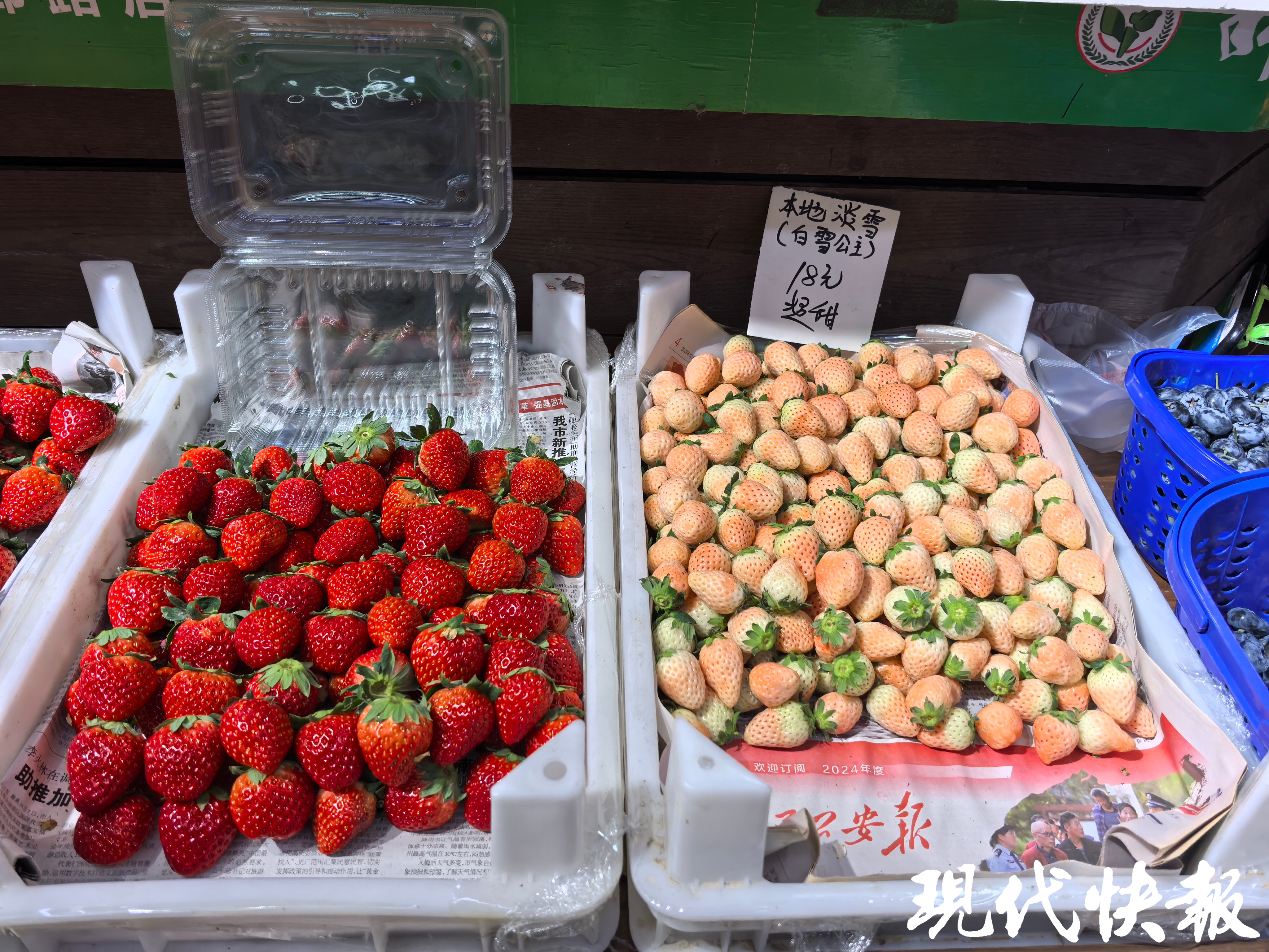 除了车厘子,草莓也进入热销季。商超内,草莓多以盒装形式售卖,折合下来一颗草莓价格两三元,与一颗车厘子价格不相上下。街头水果摊的草莓则以溧水、句容等南京周边产区为主,品种涵盖红颜草莓、奶油草莓等,部分单价在14元至35元一斤。其中,白中带粉的“白雪公主”草莓格外吸睛,售价18元一斤。