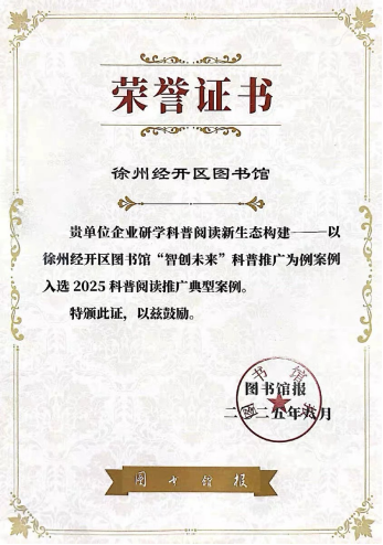 近日,徐州经开区图书馆创新实践案例《企业研学科普阅读新生态构建——以徐州经开区图书馆“智创未来”科普推广为例》成功入选2025年度全国科普阅读推广优秀案例,标志着经开区图书馆在推广科普阅读与产业认知深度融合方面取得的成效,获得国家级权威认可。