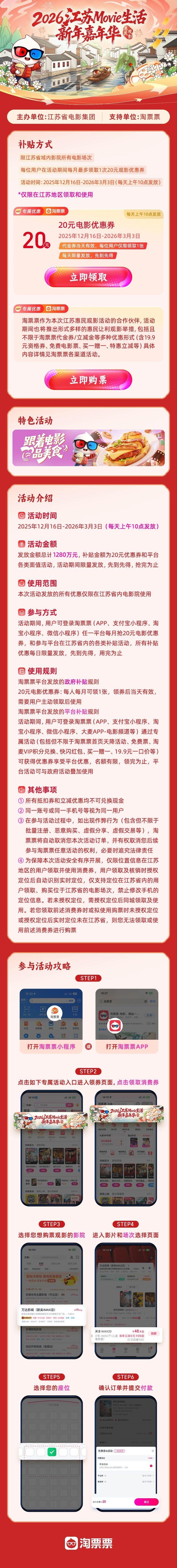 在此期间,观众凡是购买江苏地区影院的电影票,都有机会获得“立减20元”观影消费券。活动期间,每日上午10时起,市民可通过淘票票App或支付宝、淘票票小程序领取观影消费券。此外,活动还将同步投放不少于100万份随机金额观影红包,为观众带来更多惊喜优惠。