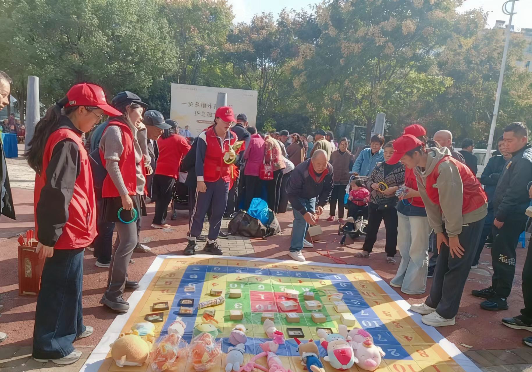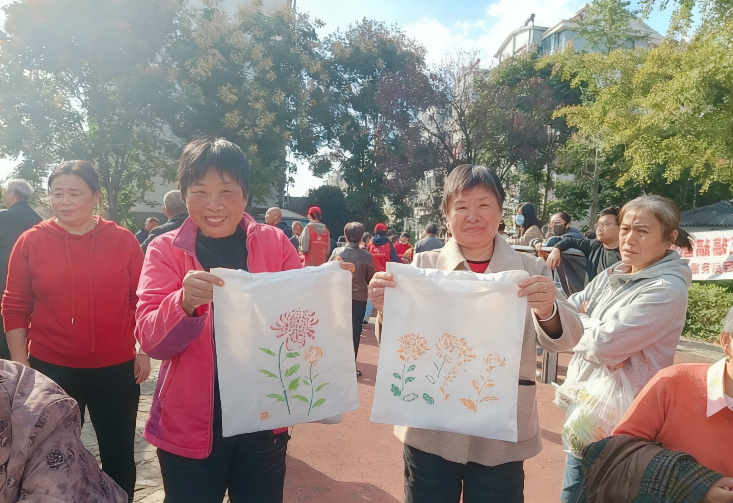 除了精彩的文艺演出,社区还精心设置护老服务区与重阳民俗体验区。护老服务区内,采耳服务与AI智能体检项目深受老年人青睐,志愿者耐心细致地为老人们提供健康关怀;智慧助老专区里,志愿者手把手教导老年人使用智能手机进行视频通话、预约挂号等操作,帮助老年群体跨越“数字鸿沟”,更好地融入现代生活。民俗体验区则充满传统韵味,茱萸香囊DIY、菊花主题帆布包手绘、中药香牌制作、拓印、套圈、投壶等活动吸引众多老人与孩童共同参与,在亲手实践中感受传统文化魅力,既寄托了健康长寿的美好祝愿,也增进了亲子间的情感交流。“今天玩得太开心了,投壶、拓印、做香包,还领到了实用的服务,社区太贴心了!”一位参与非遗游戏的老人笑着说道。