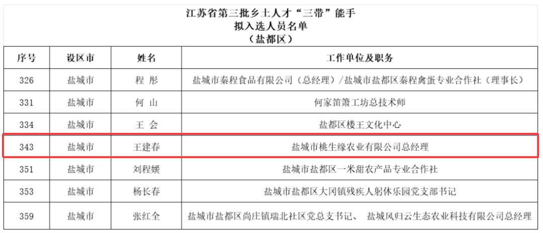 近日,省人社厅网站公示第三批乡土人才“三带”名人、“三带”能手拟入选名单,盐都区台创园桃生缘农业有限公司总经理王建春入选第三批乡土人才“三带”能手。