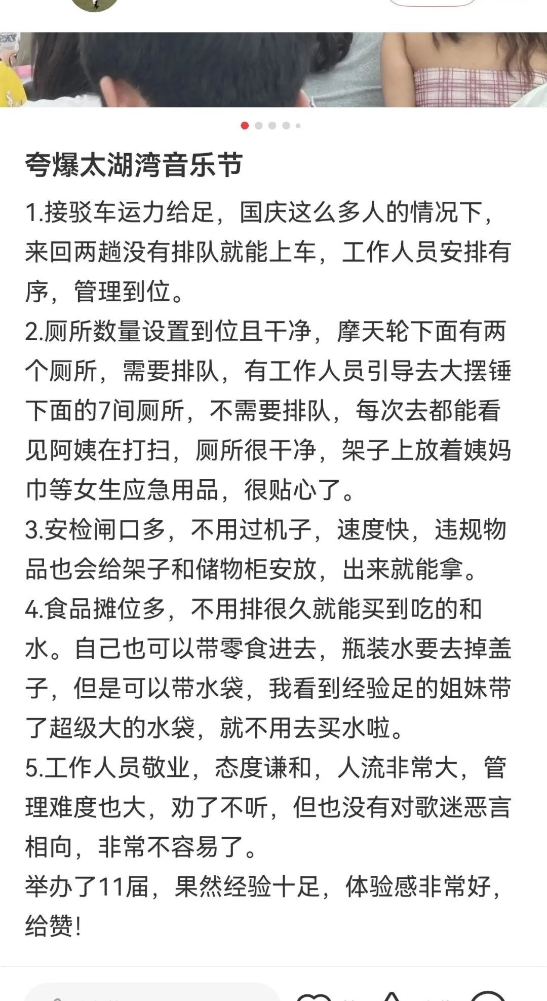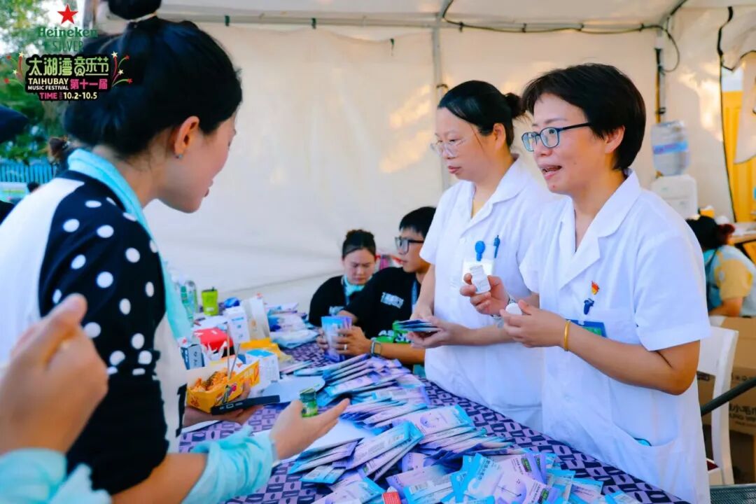 交警队伍4天64小时在岗,车辆突发故障,铁骑3分钟抵达、5分钟清障;市文广旅局、市文化执法支队全程服务保障;排队乐迷入场,保洁人员跟在队伍末端及时清洁,把最干净的场地留给大家;双节将至,太湖湾特别定制一万块文创月饼现场发放;应对不同天气,工作人员给每位乐迷发雨衣、在现场洒水降温……